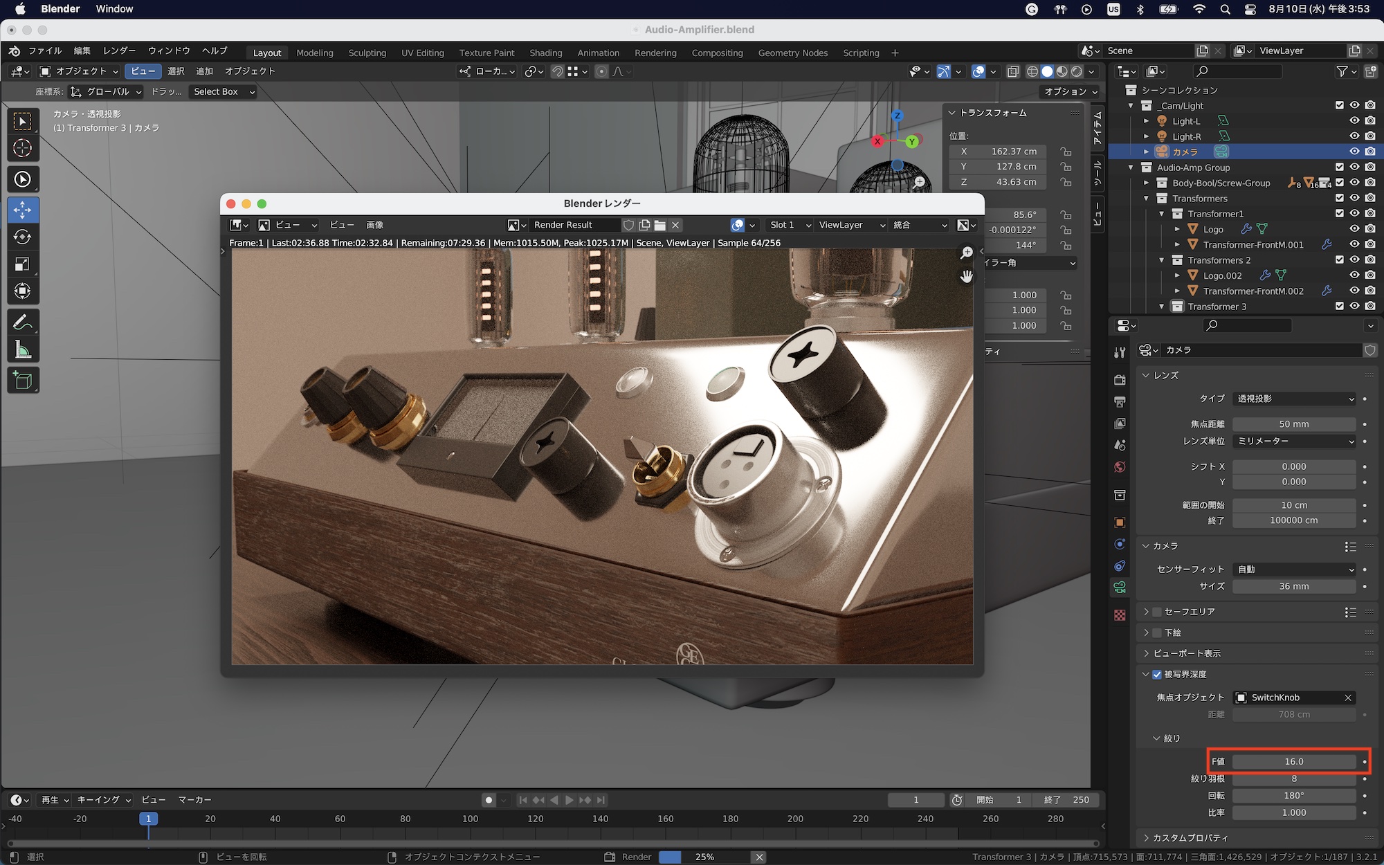 被写界深度はフォトリアルなシーンを作成する場合におすすめであるものの、レンダリングの時間がかなり掛かる場合があるので、レンダリングでのサンプル数を変更したり、カメラに映らないものは非表示にしたり調整を行うと良いかもしれません。