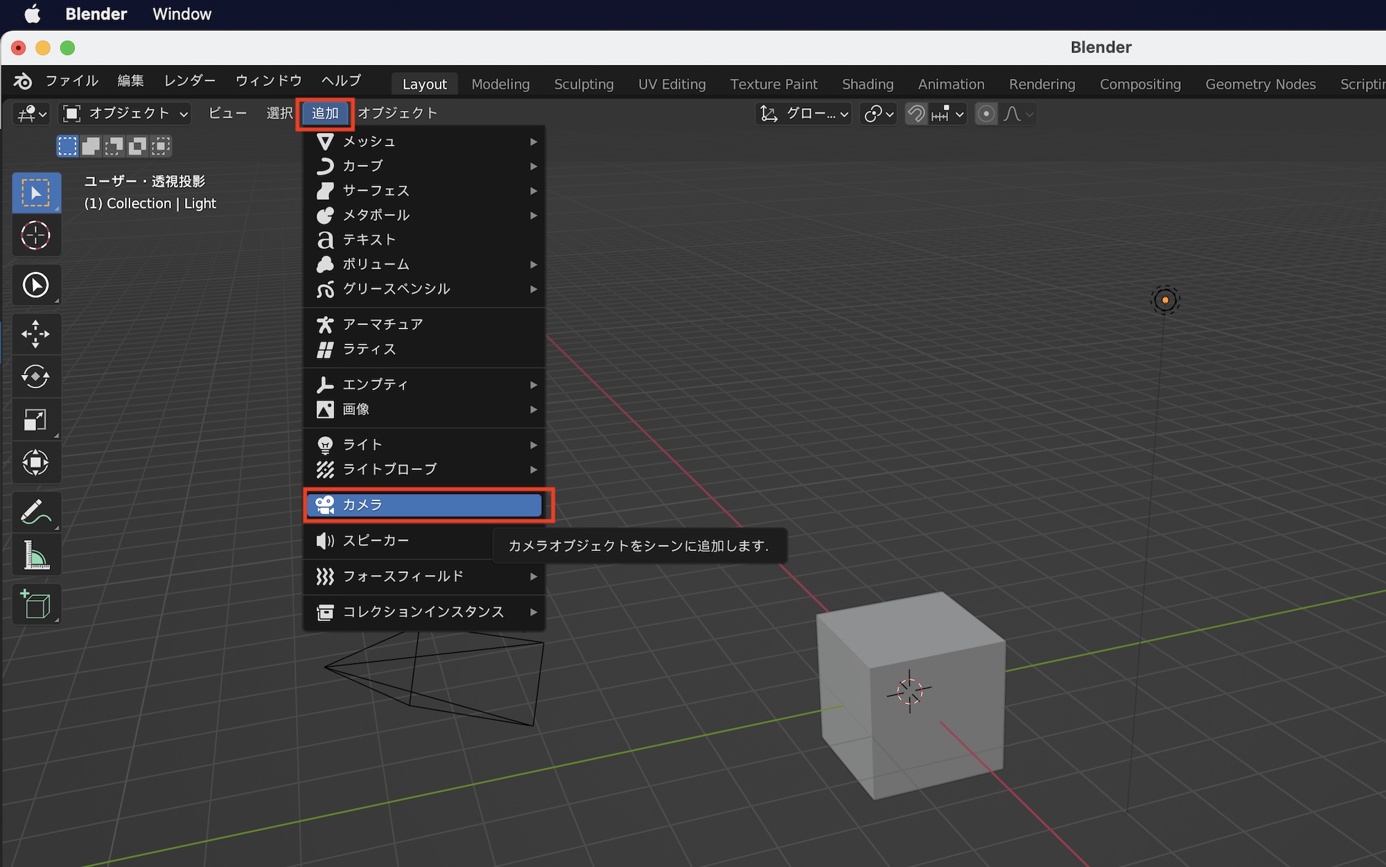 カメラオブジェクトは複数追加することもできます。削除したカメラオブジェクトを新しく追加したり、カメラを増やしたい場合はオブジェクトモードにした状態で、ビューポート上部の「追加」から「カメラ」を選ぶか、「Shift + A」のショートカットキーから追加します。