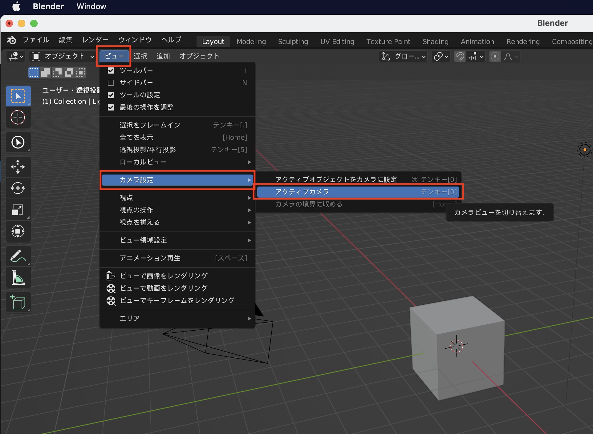 ビューポート上部の「ビュー」、「カメラ設定」の「アクティブカメラ」をクリックするとカメラのビューに切り替わります。カメラビューを解除する場合は同じように操作すると良いでしょう。また、この操作はテンキーがあればショートカットキー「0」でも行えます。
