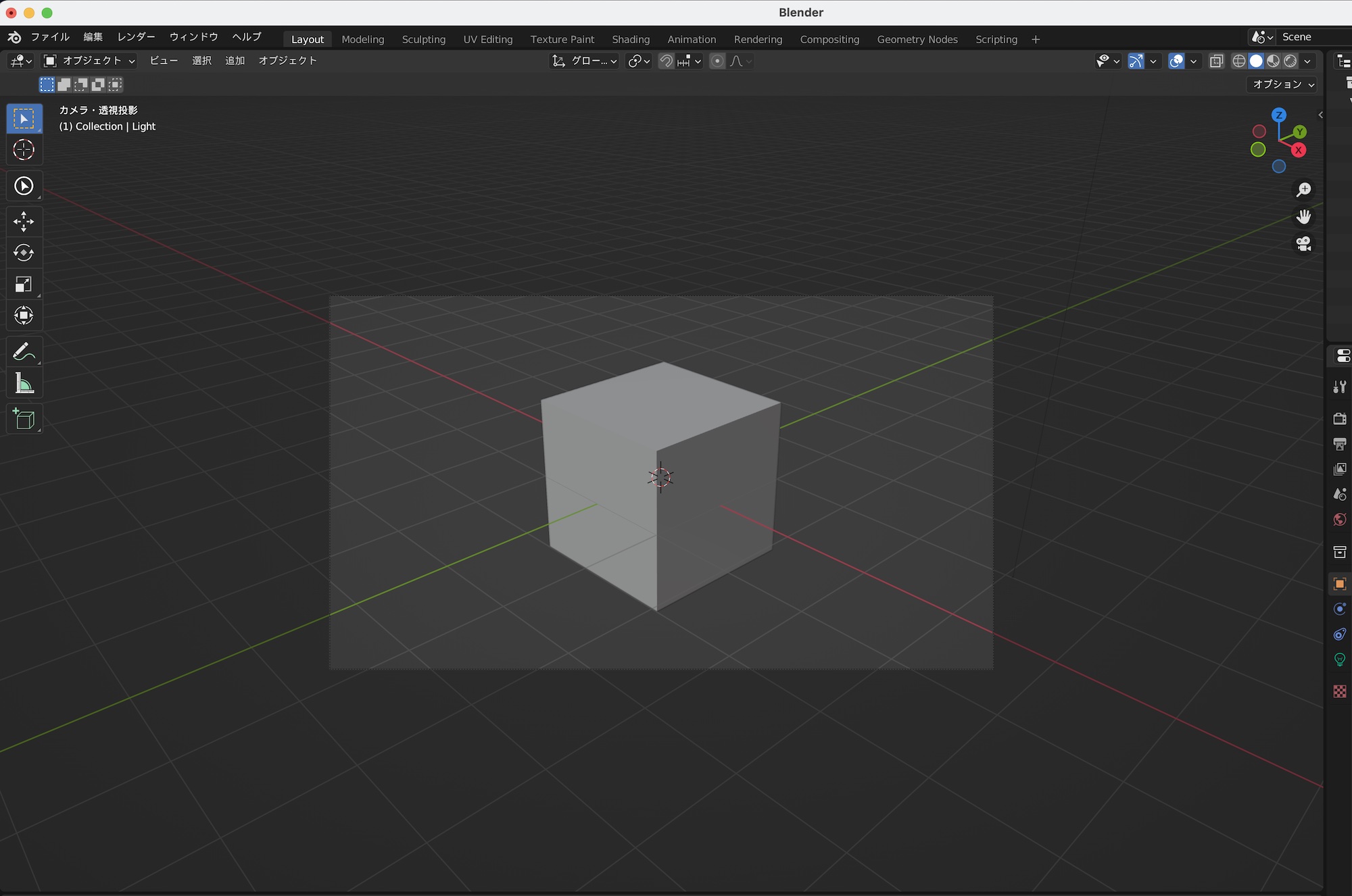 Blenderで新しくシーンを作成する際、立方体とライトオブジェクトに加えてカメラオブジェクトが用意されています。