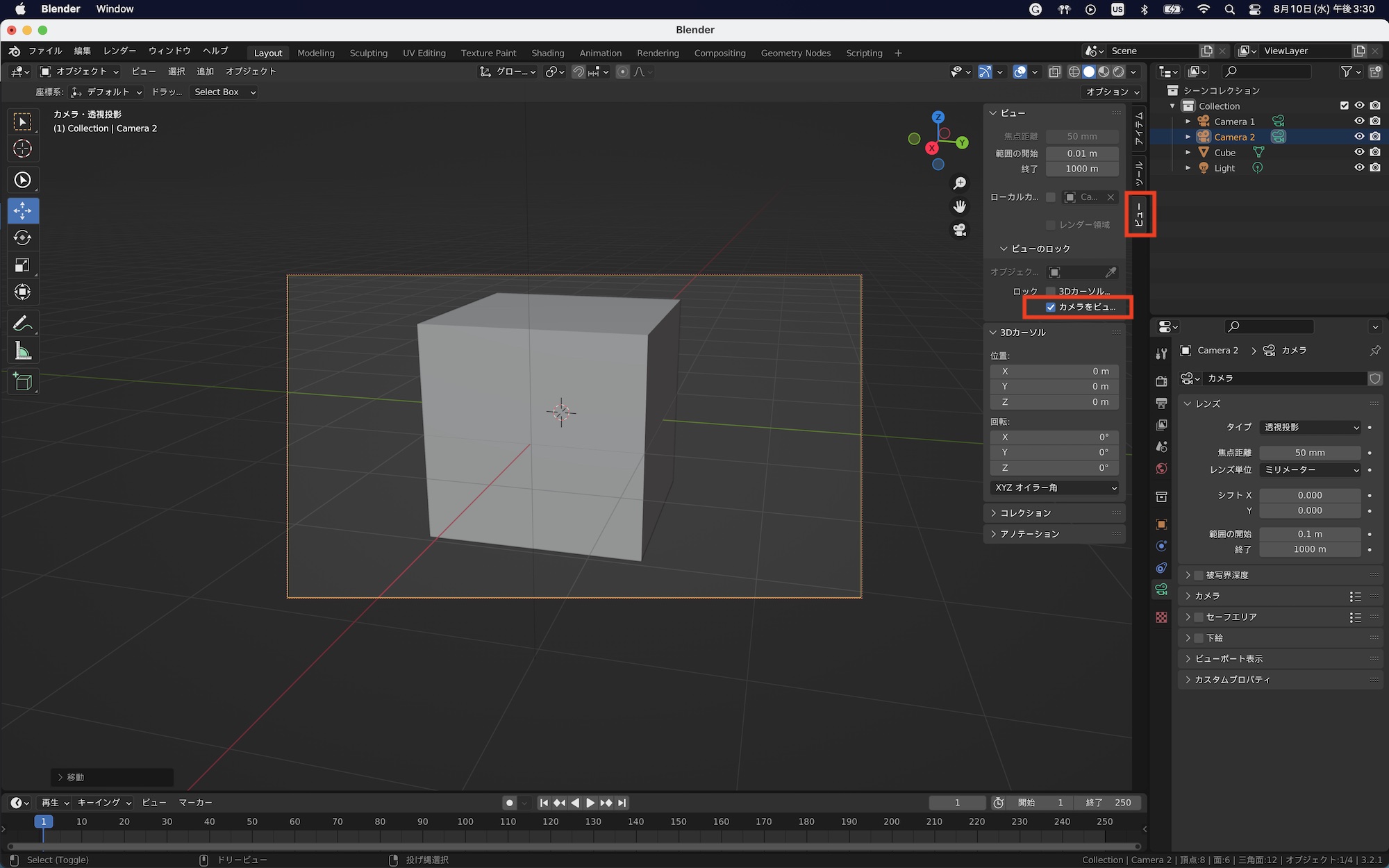カメラ越しにシーンを確認するには「アクティブカメラ」を行う必要があります。