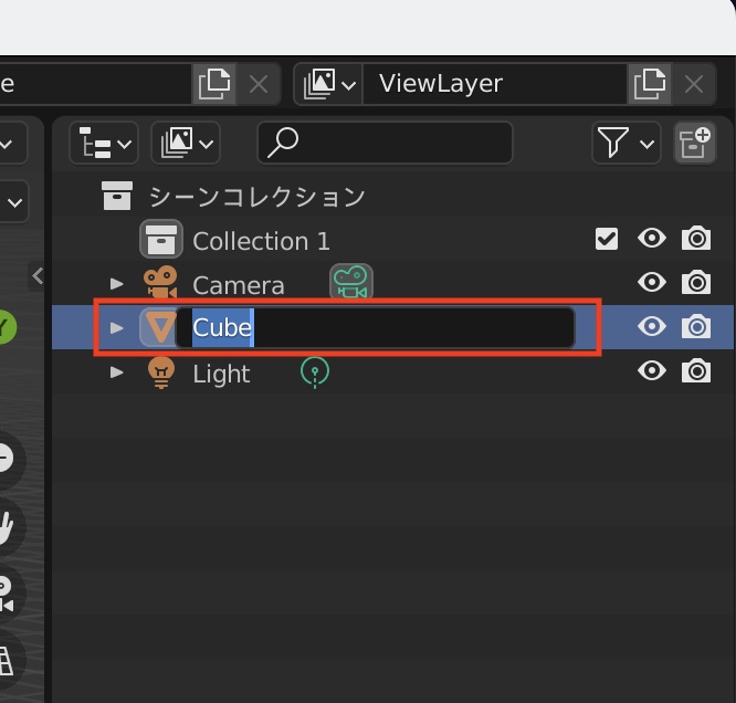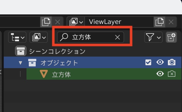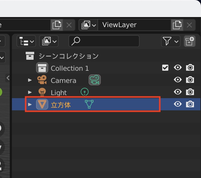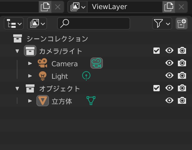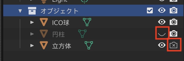上の画像を例にしてみると円柱はビューポート上で非表示、立方体はレンダリングでは非表示の設定になっています。