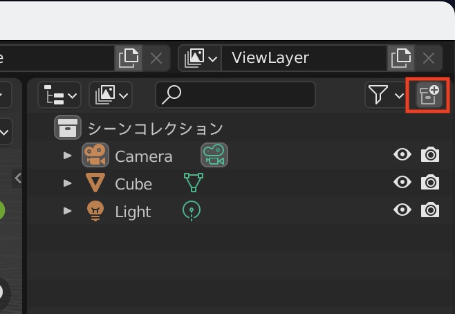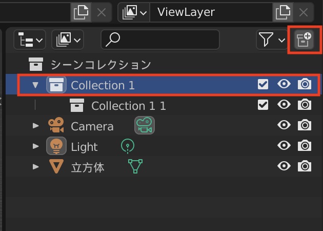 新しくコレクションを作成する場合はアウトライナーの右上にある「新規コレクション」アイコンをクリックするとアウトライナーに追加されます。
