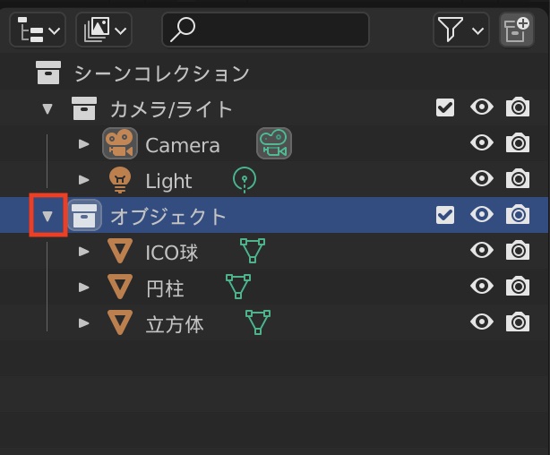 コレクションの横にある三角アイコンをクリックすると、展開されているオブジェクトが小さく収まります。