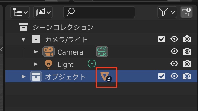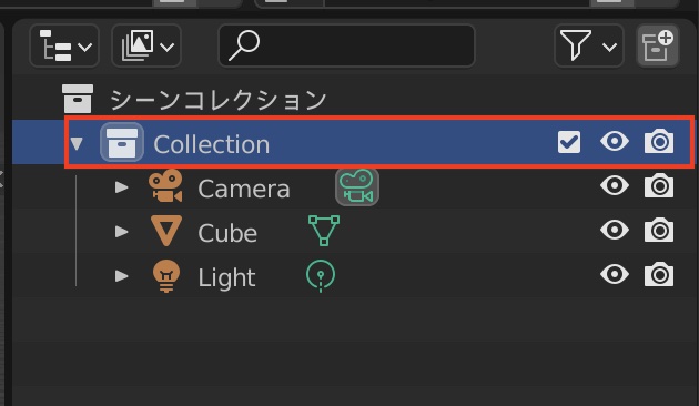 このコレクションはビューポートの右上にあるアウトライナー(Outliner)にあるもので、オブジェクトの名称変更やカメラ、ライト、メッシュなどのオブジェクトをグループまたはフォルダ機能のあるコレクションに格納できるものです。