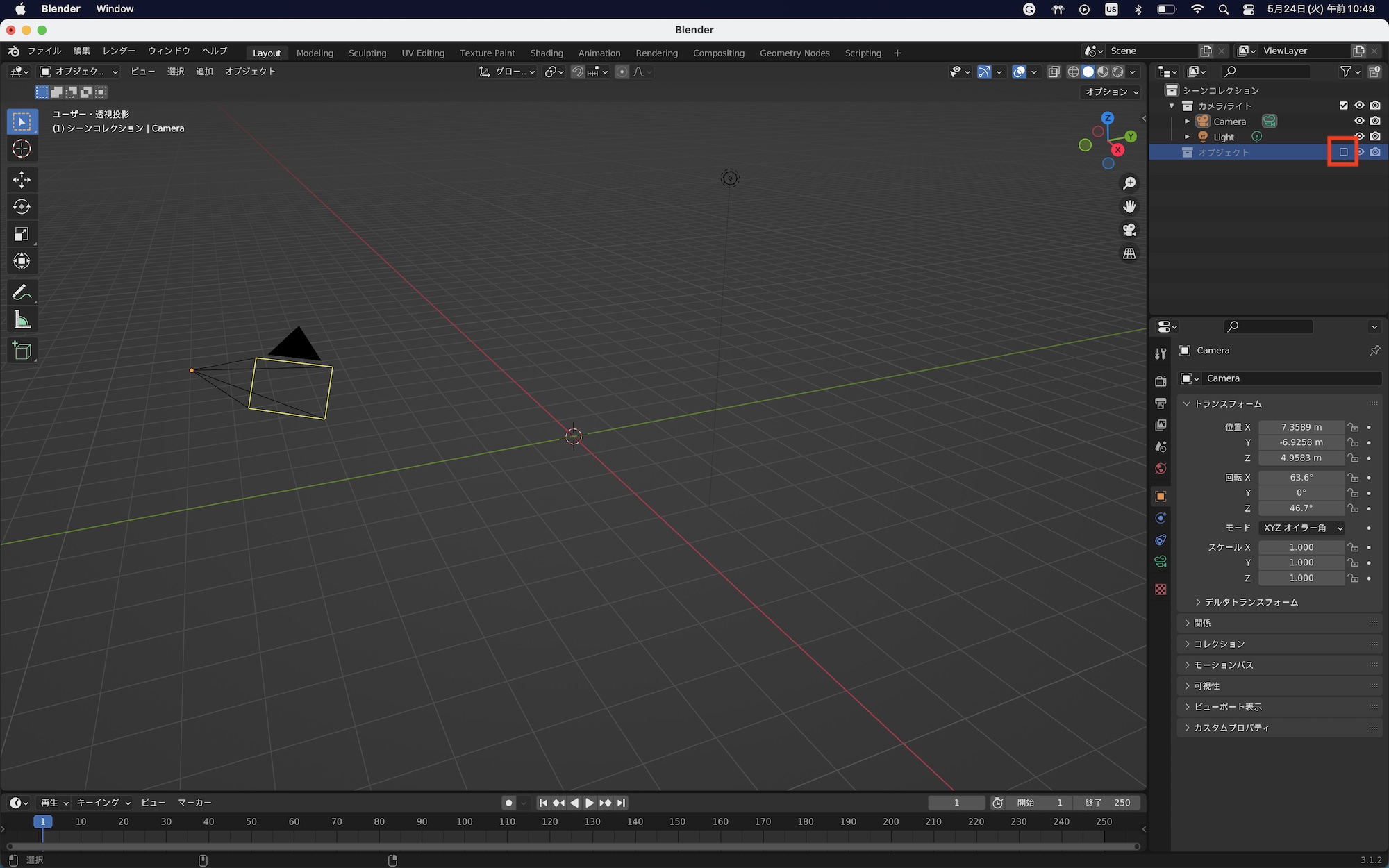 チェックを入れることでビューポート、レンダリングの両方でも非表示になりますが、ビューポート上では表示してレンダリングでは非表示に似したい場合などはチェックボックスの横にある目とカメラのアイコンをクリックします。