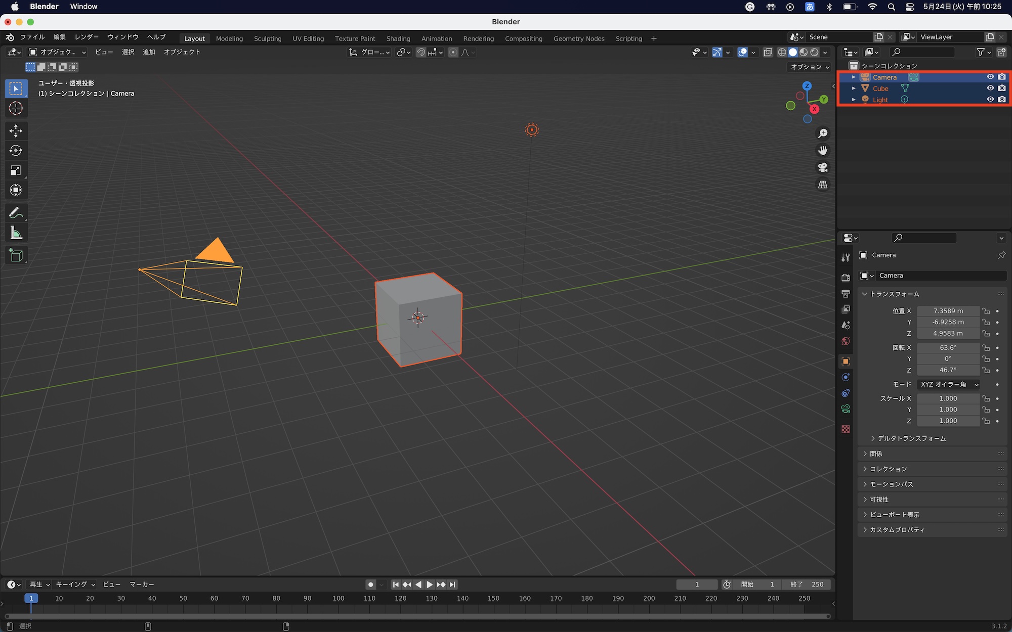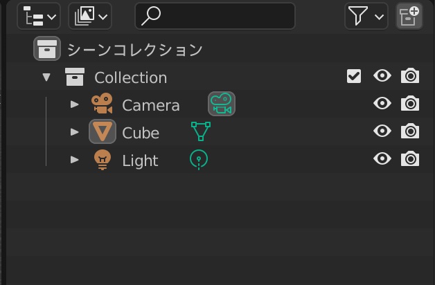 Blenderを開くとデフォルトで「シーンコレクション」が作成されており、その中に「Collection」、そして更にその中にはCamera(カメラ)、Cube(立方体)、Light(ライト)のオブジェクトが格納されています。
