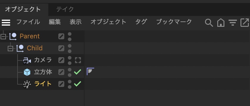 上のCinema 4Dの場合で比較してみると、オブジェクトマネージャでの操作と似ているのがわかります。こちらはヌルオブジェクトを活用する必要がありますが、ほぼ同じように操作できるようになっています。