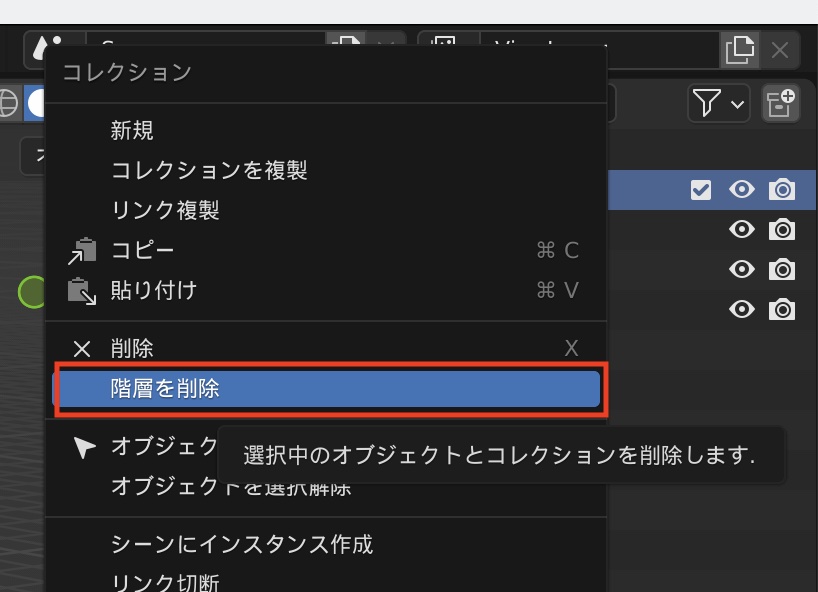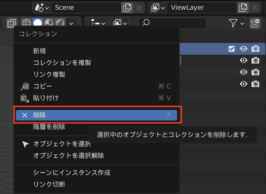 コレクションの中にあるオブジェクトは削除せず、コレクションのみを削除したい場合は右クリック「削除」またはショートカット「X」キーを使います。