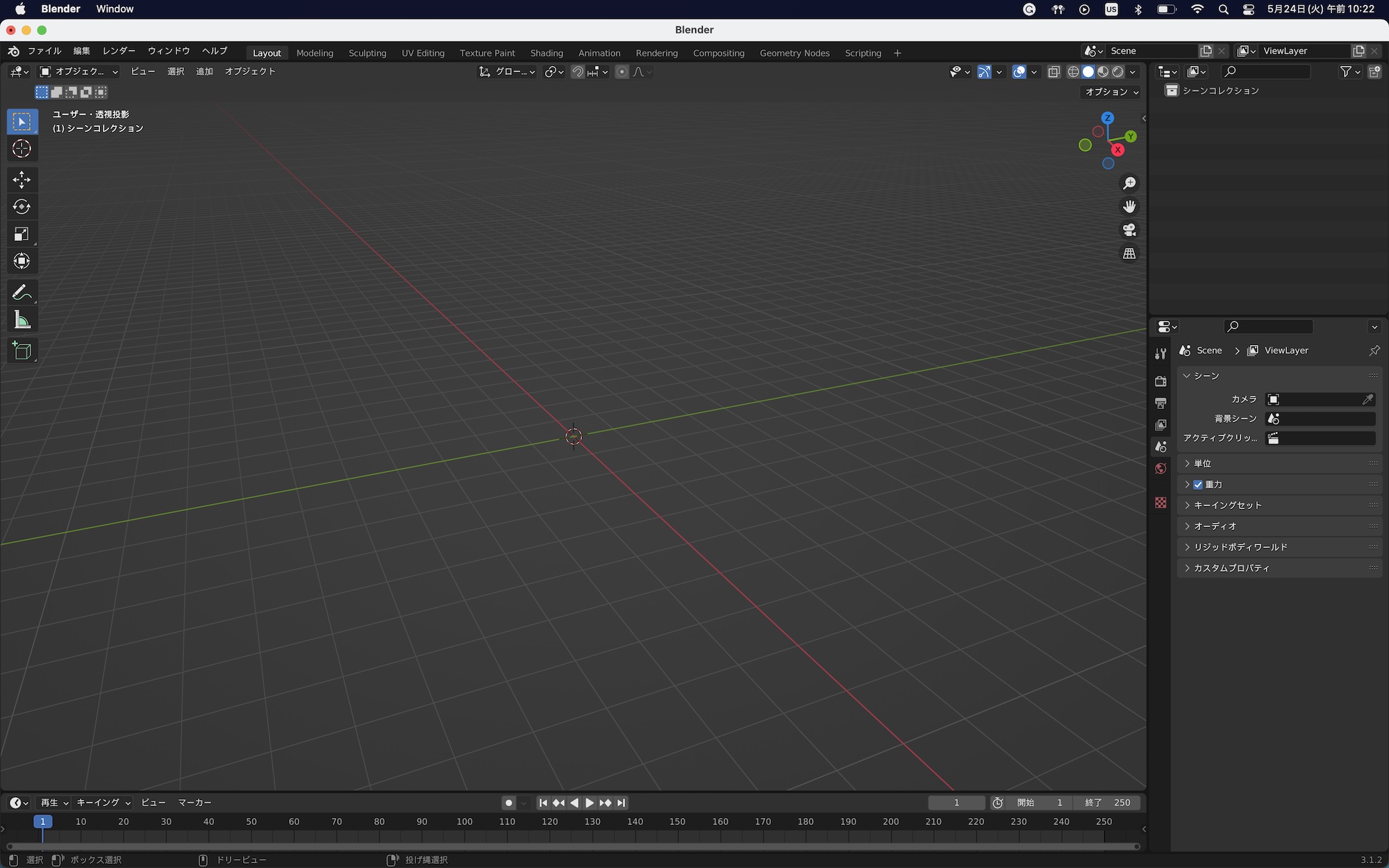 Blenderを開くとデフォルトでカメラ、立方体とライトが追加されているコレクションが作成されているので、これらのオブジェクトを元にシーンを作成することも可能ですが、必要ない場合はコレクションを選択して右クリック「階層を削除」で削除すると良いでしょう。
