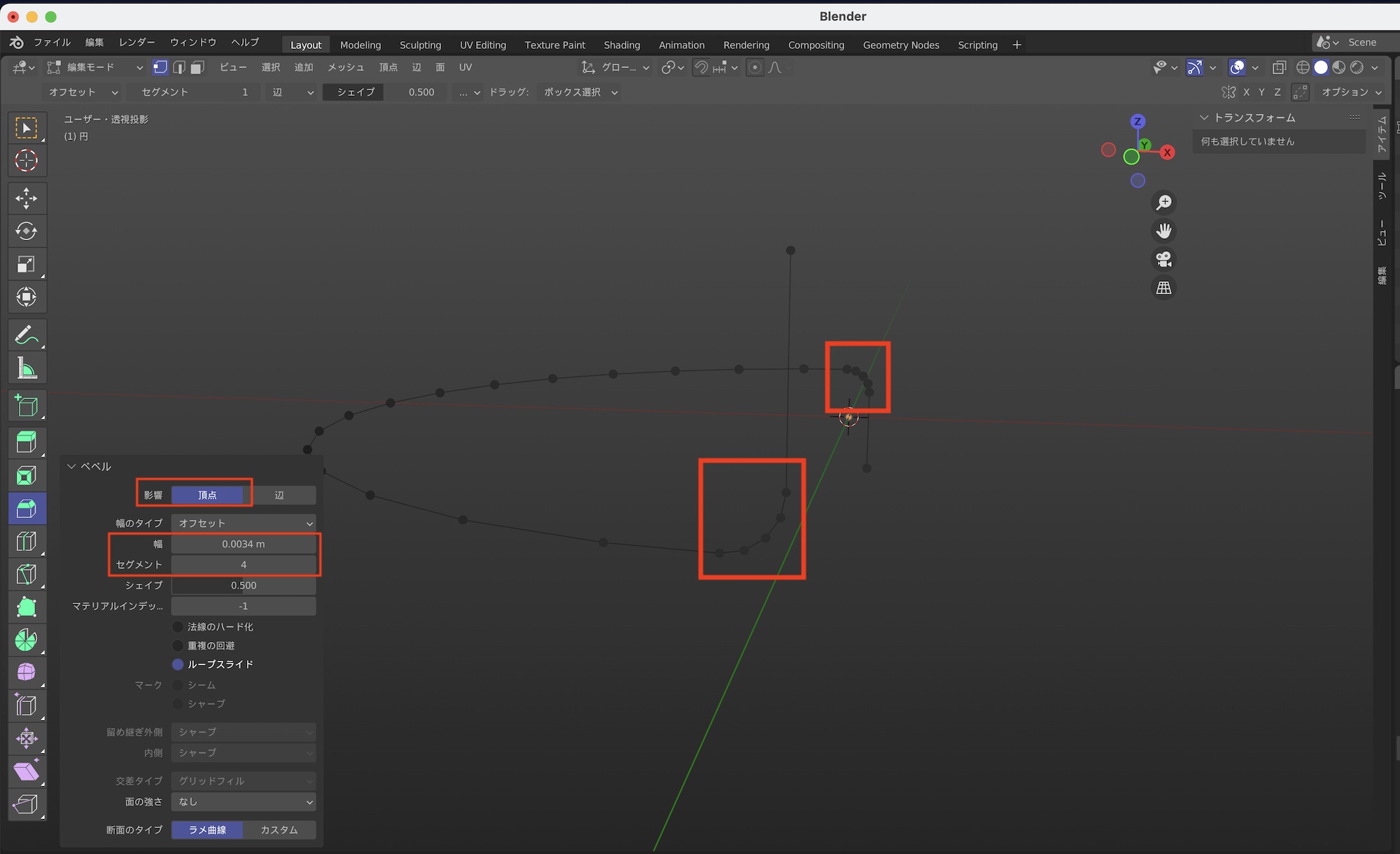 ベベルを使っても何も変化しない場合は、左下のオプションで「影響: 頂点」を選択し、「幅」と「セグメント」から分割数などを調整してください。