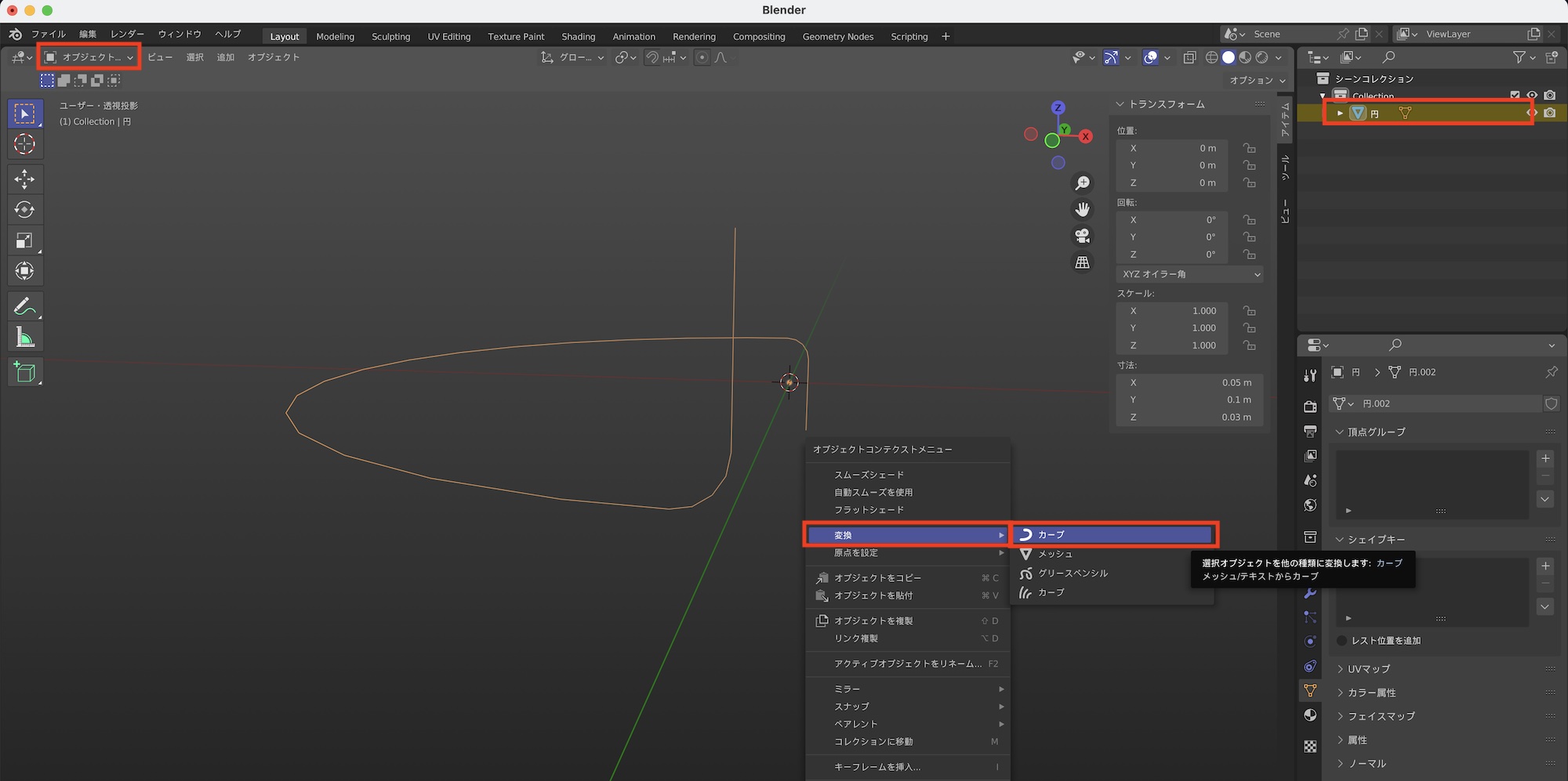 オブジェクトモードに切り替えて、作成したメッシュを選択後に右クリック「変換」、「カーブ」を選択してカーブに変換します。
