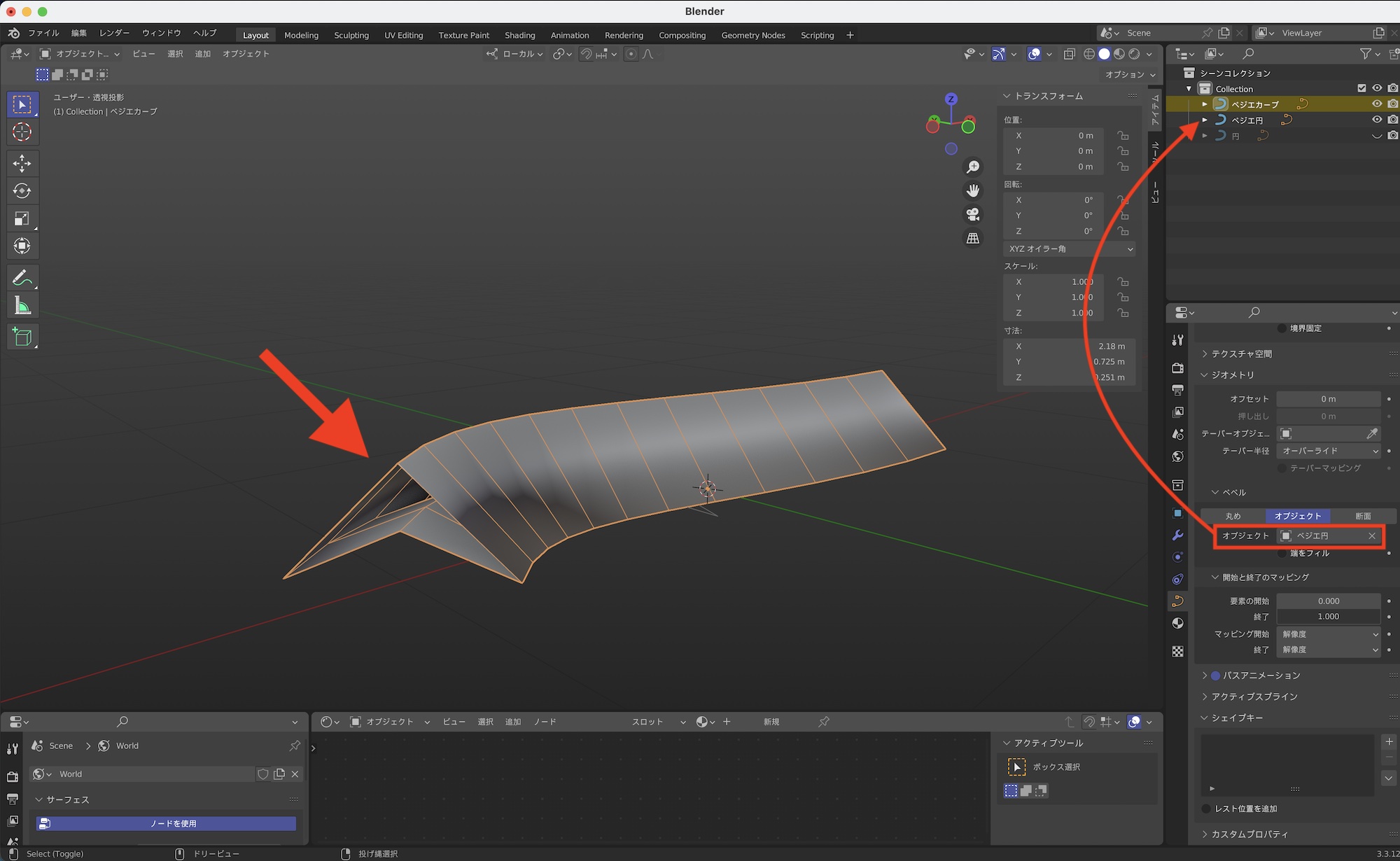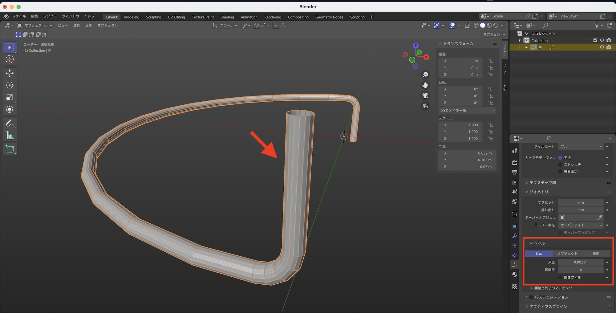 カーブはただ線を引くだけのツールのみならず、パイプ(チューブ)や手すりなどを表現するには最適な「ジオメトリ」が用意されており、「ベベル」の項目から厚みを加えられます。