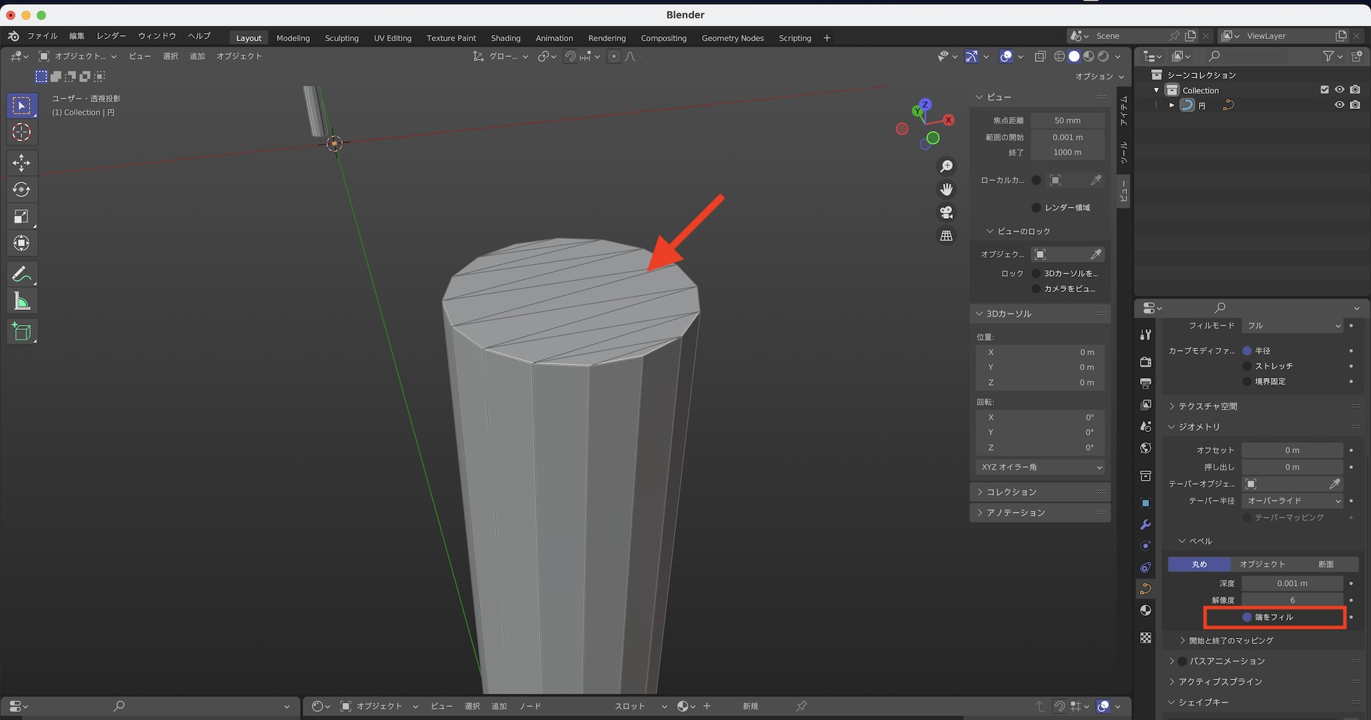 オブジェクトデータプロパティの「端をフィル」のオプションを有効化することで、両端に面が追加されます。空洞にしたくない場合に活用すると良いでしょう。