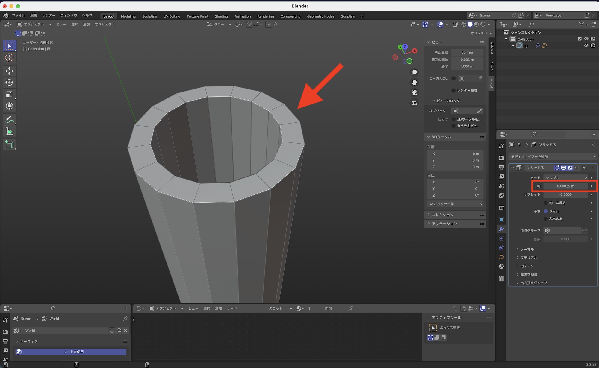 空洞部分に厚みを加えたい場合は「ソリッド」モディファイアーを追加します。モディファイアー追加後に「幅」のパラメータを操作すると良いでしょう。