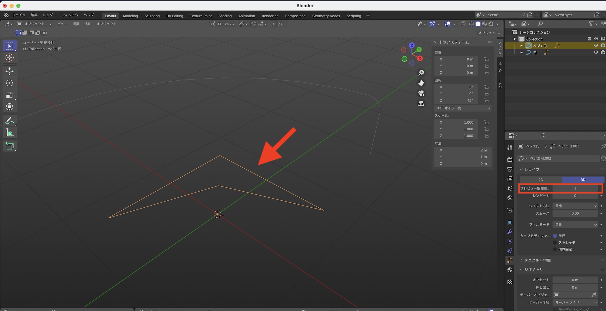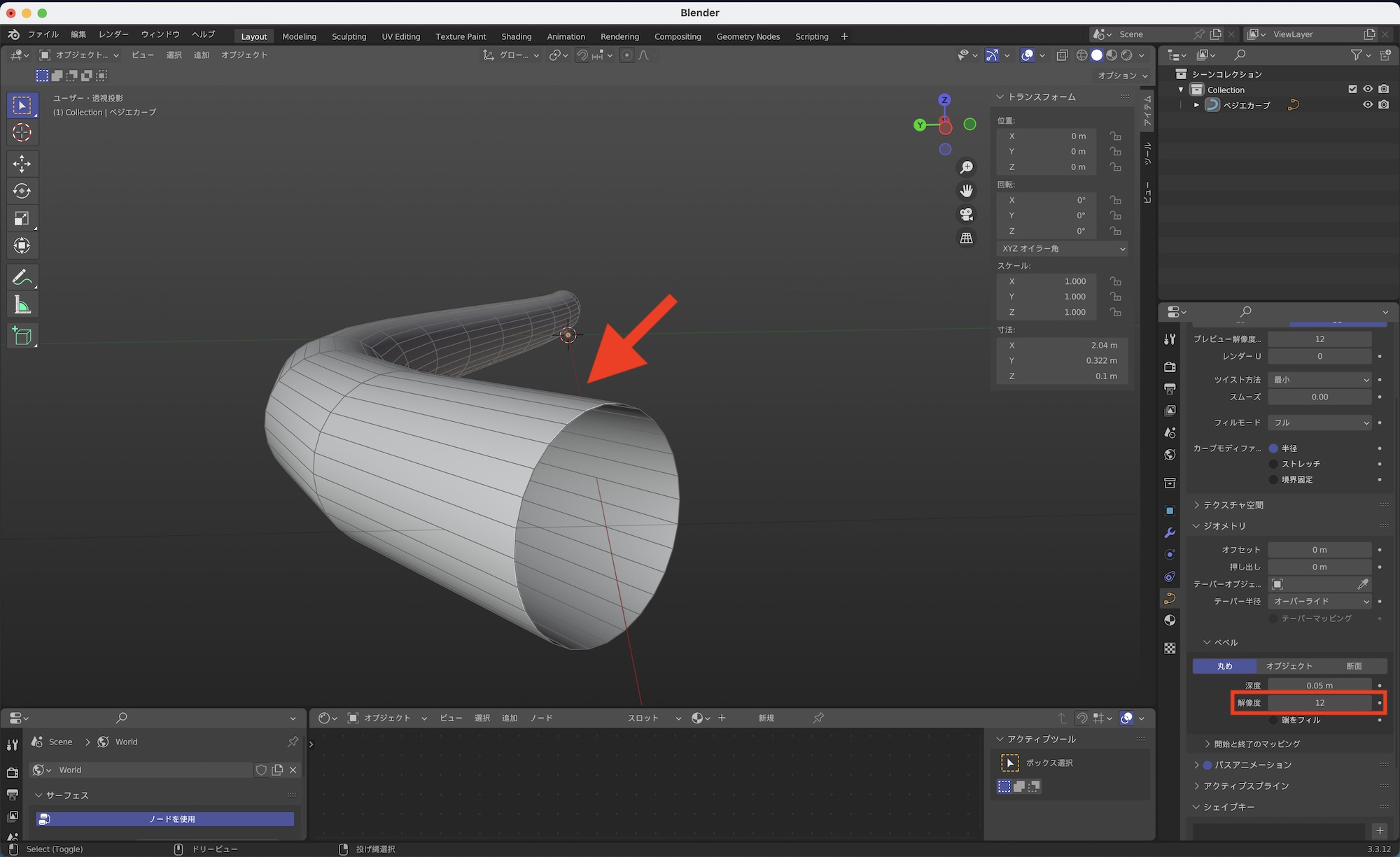 「解像度」からジオメトリを追加した際の分割数を調整します。サブディビジョンサーフェスを使わずに丸みを表現する場合は「解像度」を変更すると良いでしょう。