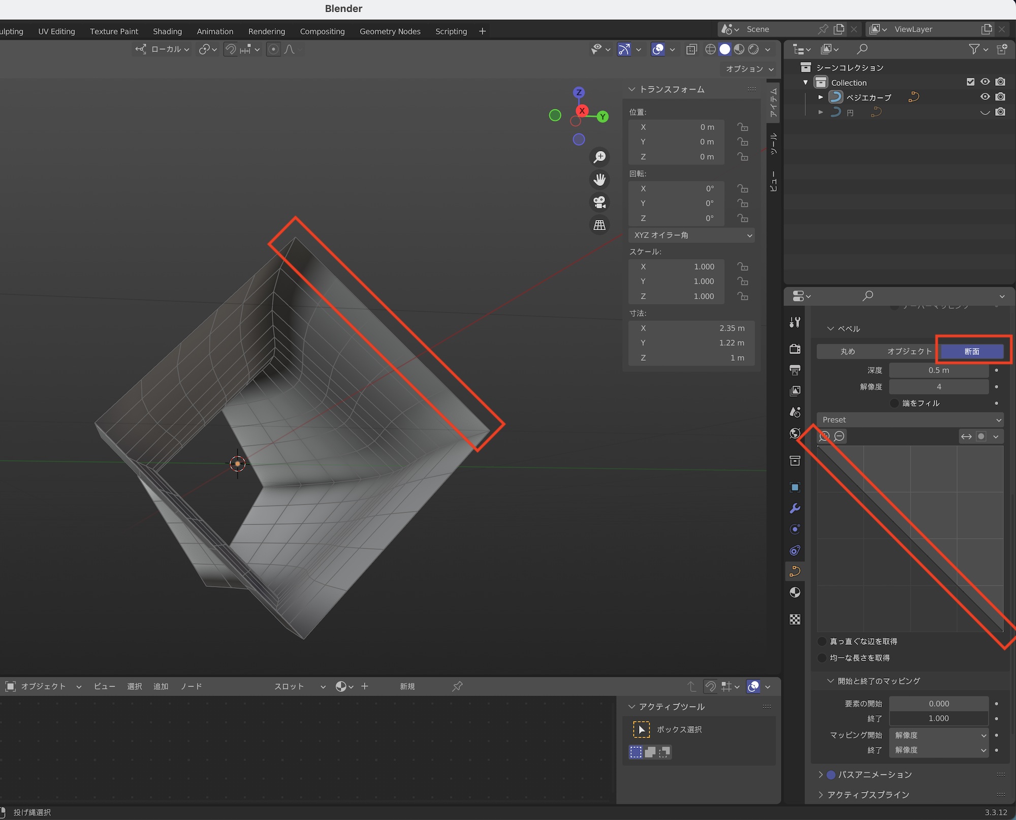 カーブを使って簡単にパイプなどを作成できるものの、ベベルや押し出しなどが使えるメッシュと操作が若干異なります。建物の形に沿って配管を表現したり、カーブハンドルを使用せずに、ベベルで角の滑らかさを調整したい場合は、メッシュから作成することも可能です。