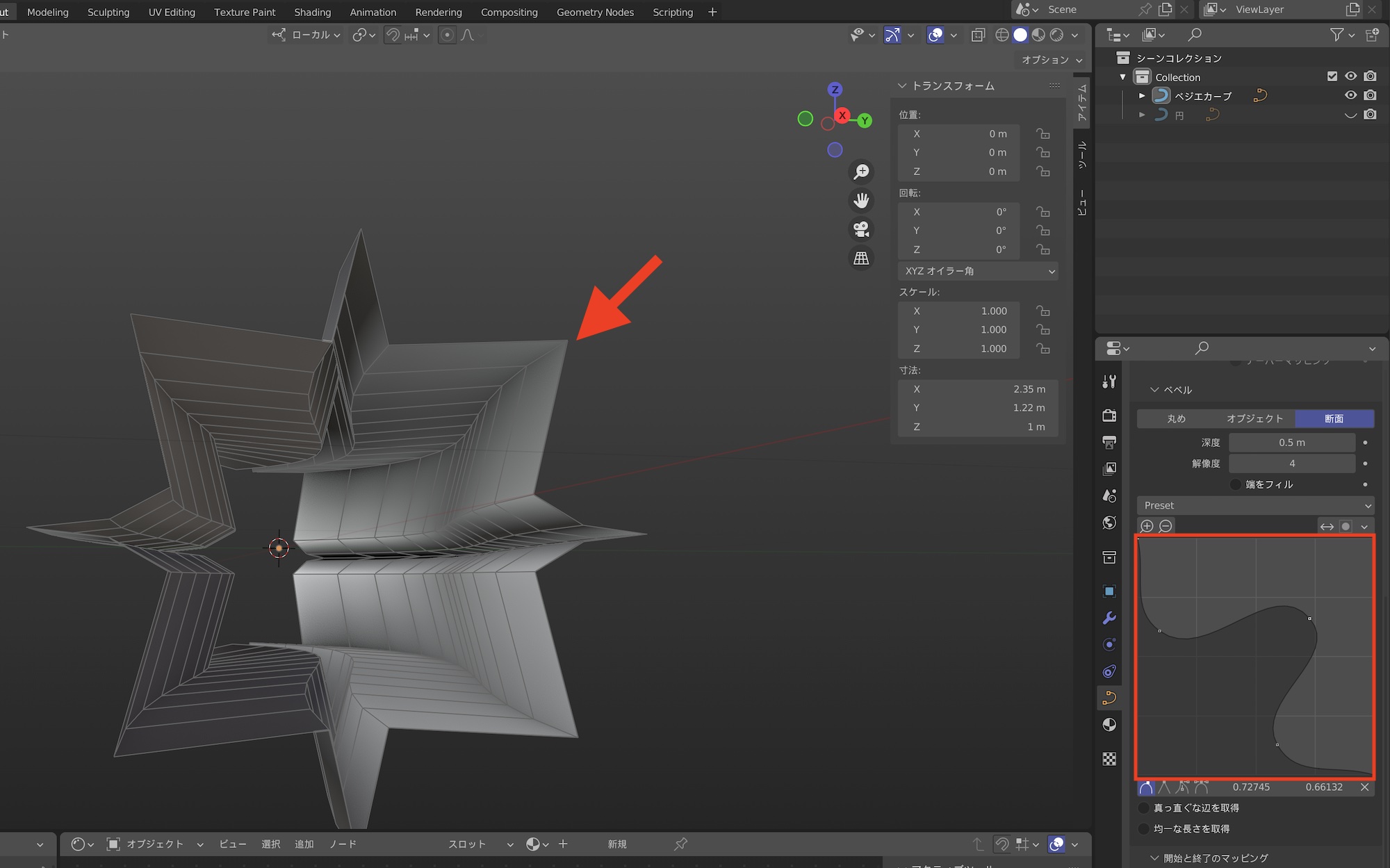 「断面」では下に表示されるカーブを使って自由自在に変形できます。このカーブはオブジェクトを四分割にした一つの部分を表示しており、カーブにポイントを追加することで形を変更できます。