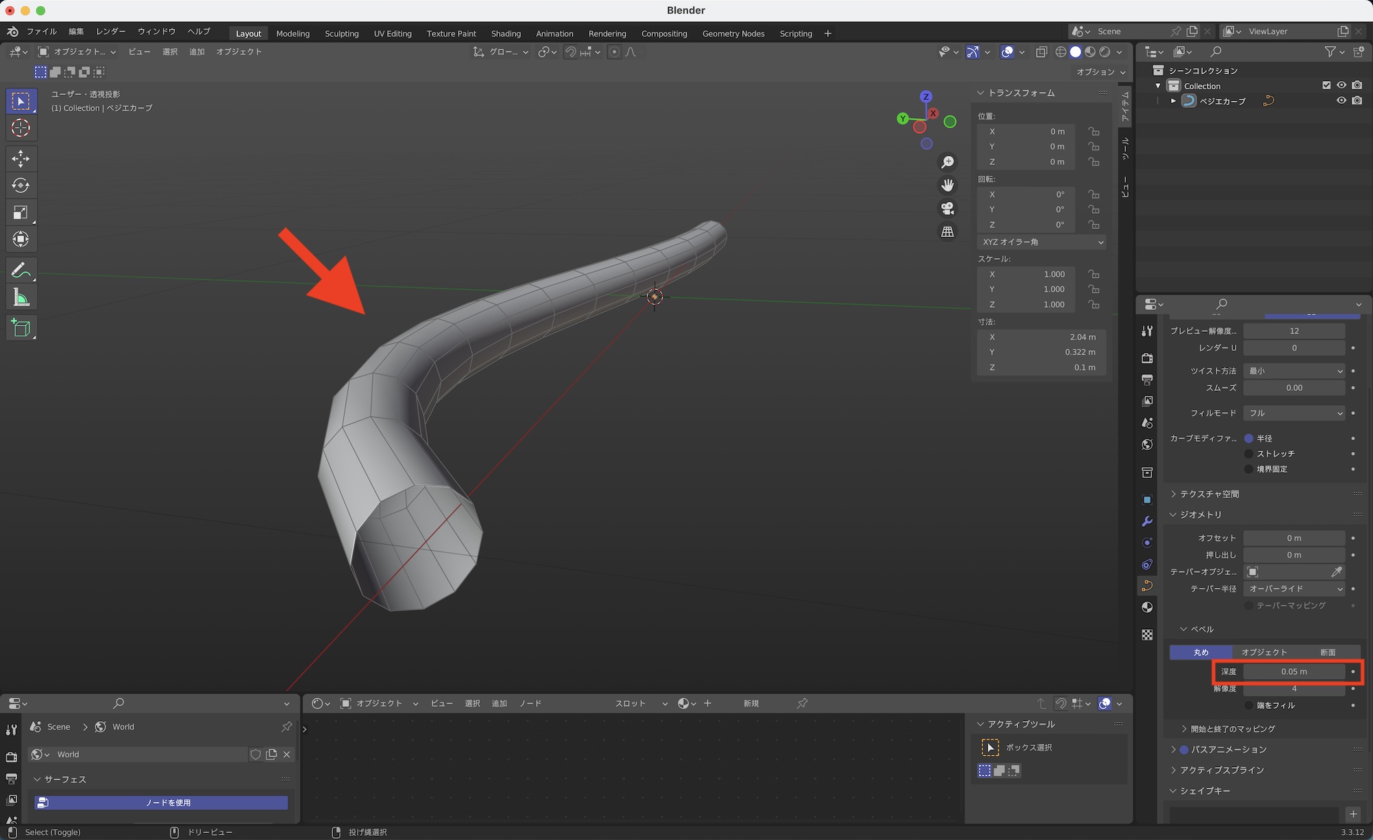 「深度」のパラメータを調整することで、カーブの形に沿ってパイプのような円形の筒状のオブジェクトが完成します。