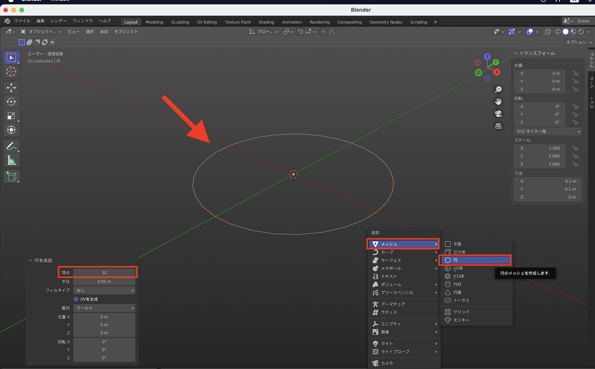 「Shift + A」または上部メニューの「追加」から「メッシュ」の「円」を選択して、円オブジェクトをビューポートに追加します。頂点(分割数)はデフォルトの「32」のままで大丈夫です。