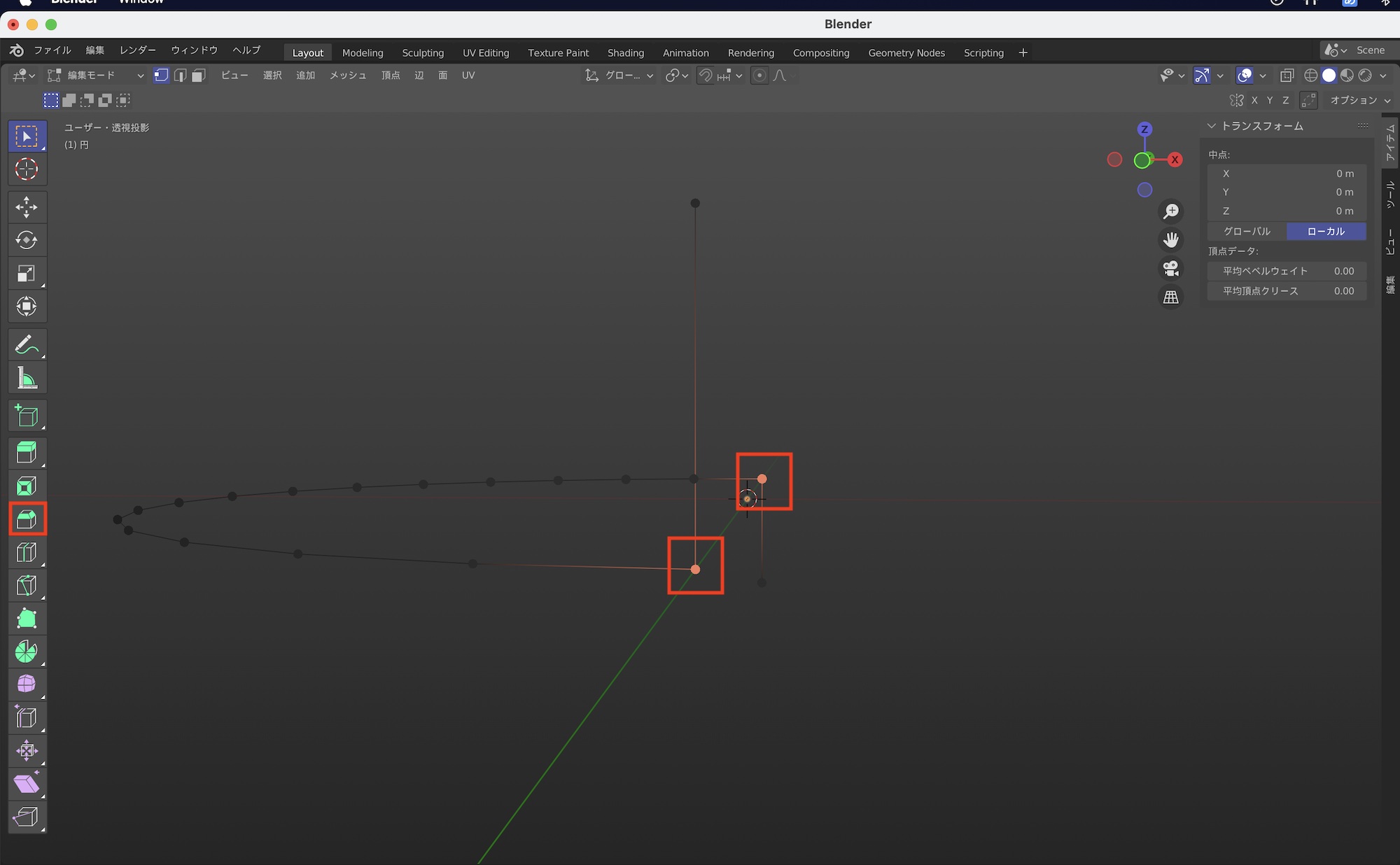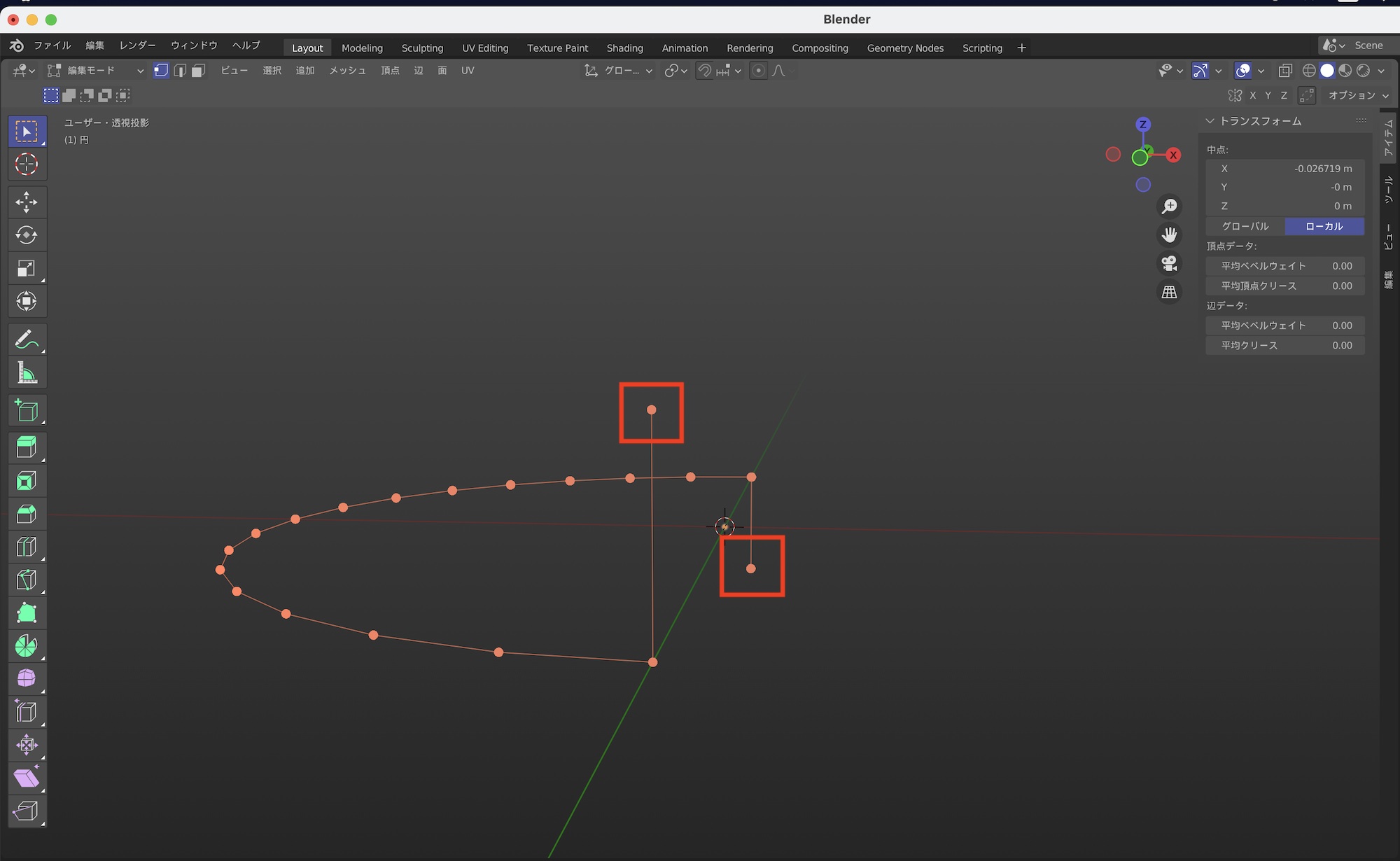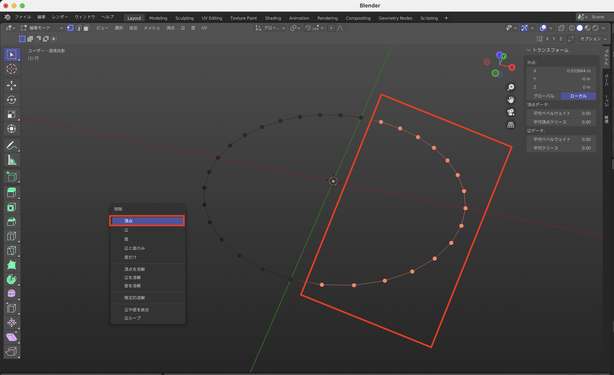 編集モードに移り、頂点選択モードで円の半分を選択して、「X」キー、「頂点」を選択して半分の頂点を削除します。