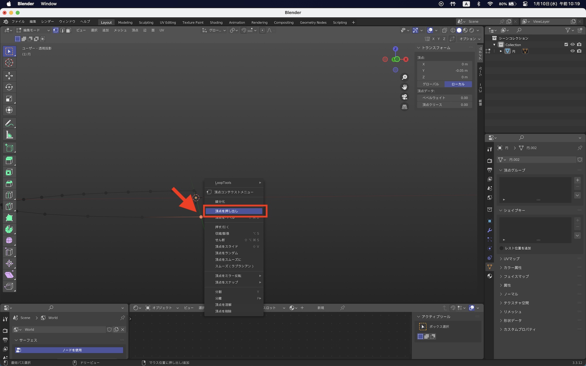 両端の頂点をそれぞれ選択し、右クリック「頂点を押し出し」を使って、上と下方向に押し出して新しい頂点を作成します。