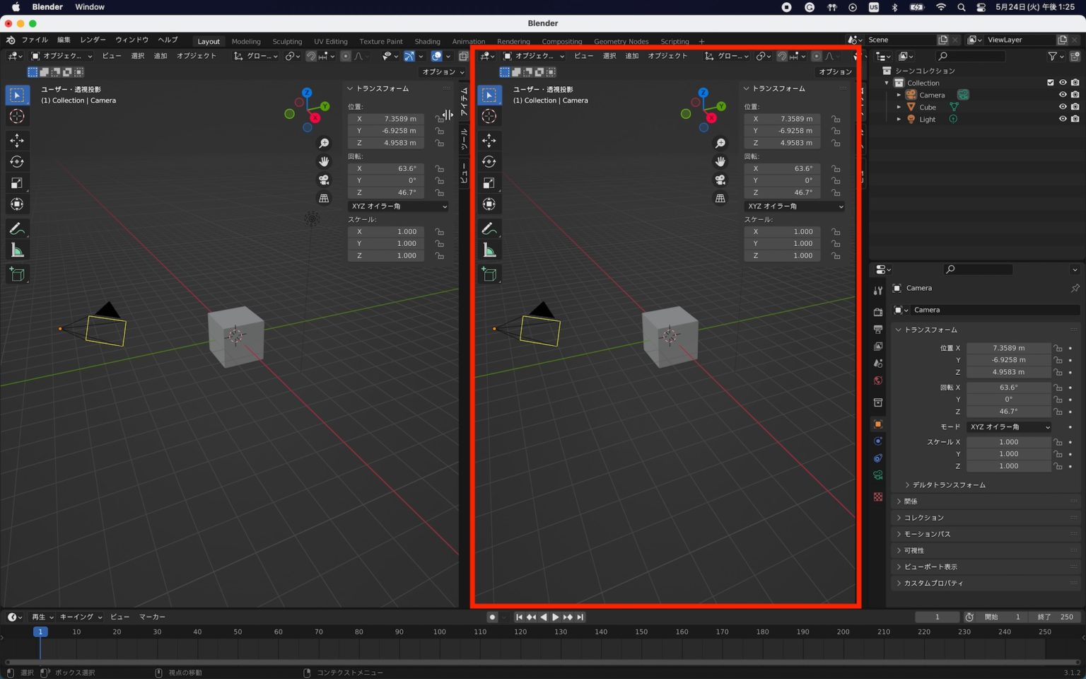 Cinema 4Dを例にしてみると、透視投影とXYZ軸の平行投影を表示するボタンがあり、そこから切り替えられますが、Blenderの場合は「Control + Option(Alt) + Q」でビューポートを4分割できます。