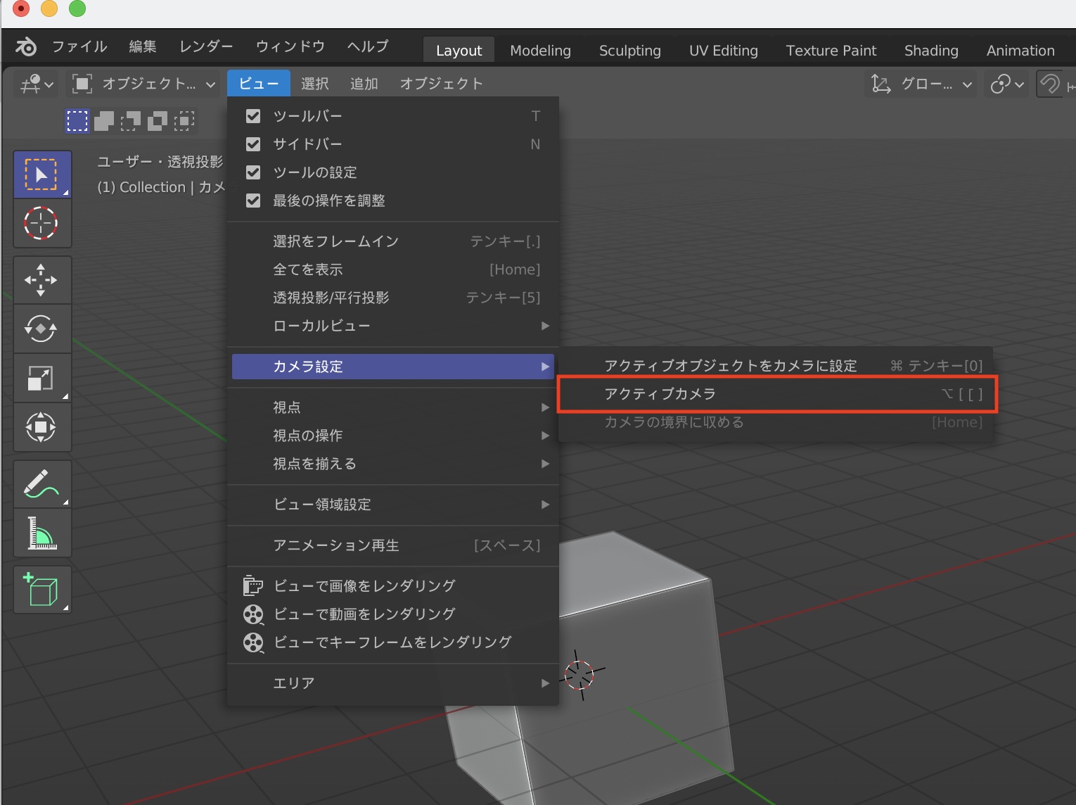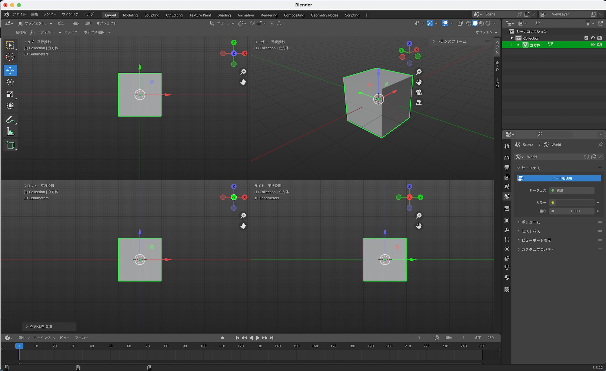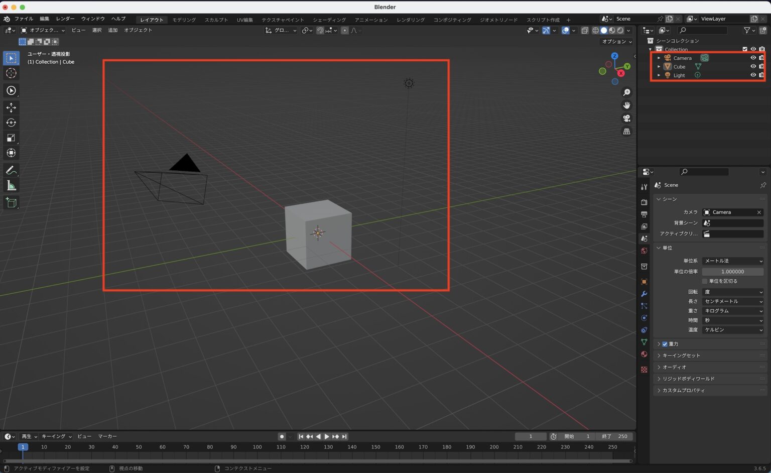 Blenderの初期設定では立方体、カメラとライトの3つのオブジェクトがワールドの中心に配置しており、多くの場合プロジェクトを作成する際に必要としません。