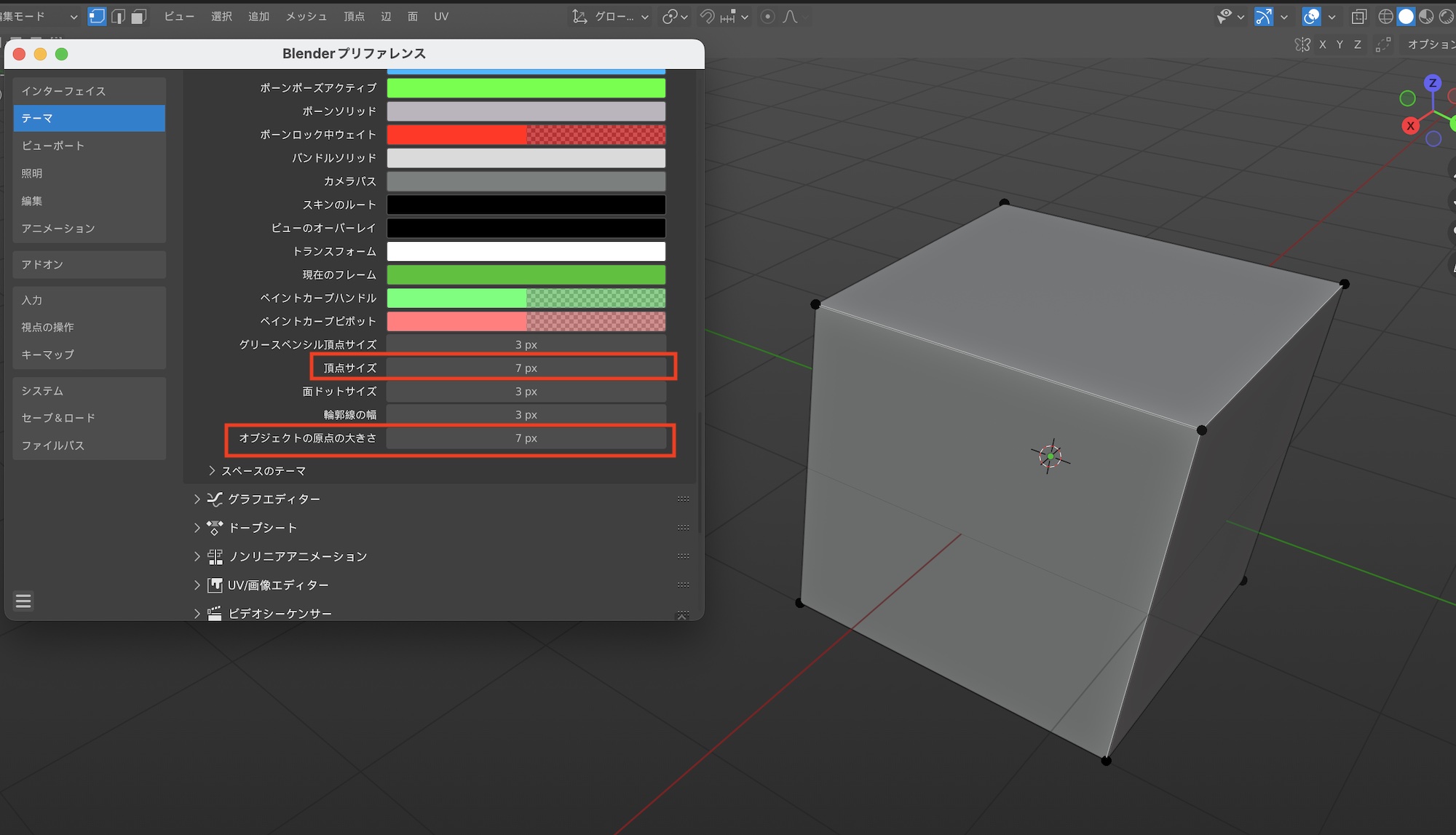 デフォルトの状態では頂点と辺が小さく、確認しづらいのですが、プリファレンスの「テーマ」、「3Dビューポート」の一番下にある「頂点サイズ」と「オブジェクトの原点の大きさ」を変更すると頂点や原点を見やすくできます。
