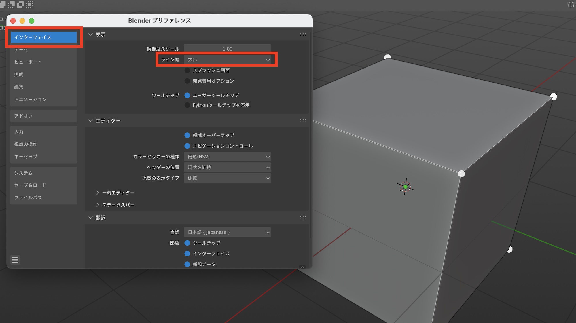 辺については太さを調整できる項目は用意されていないものの、プリファレンスの「インターフェイス」の中にある「ライン幅」を「太い」にすると、インターフェイスとオブジェクトの辺や線が若干太くなります。