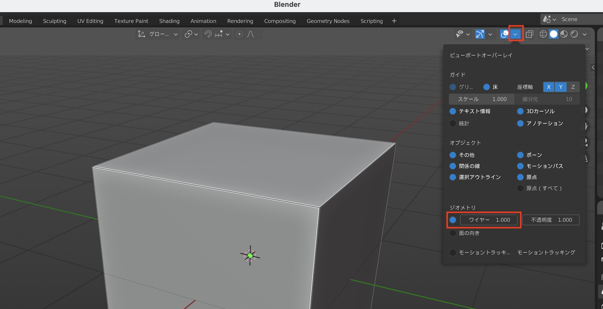 オブジェクトモードに切り替えると、辺がデフォルトで表示されていません。オブジェクトモードでも辺を確認したい場合は、オーバーレイの三角アイコンをクリックし、「ジオメトリ」の中にある「ワイヤー」を有効にします。