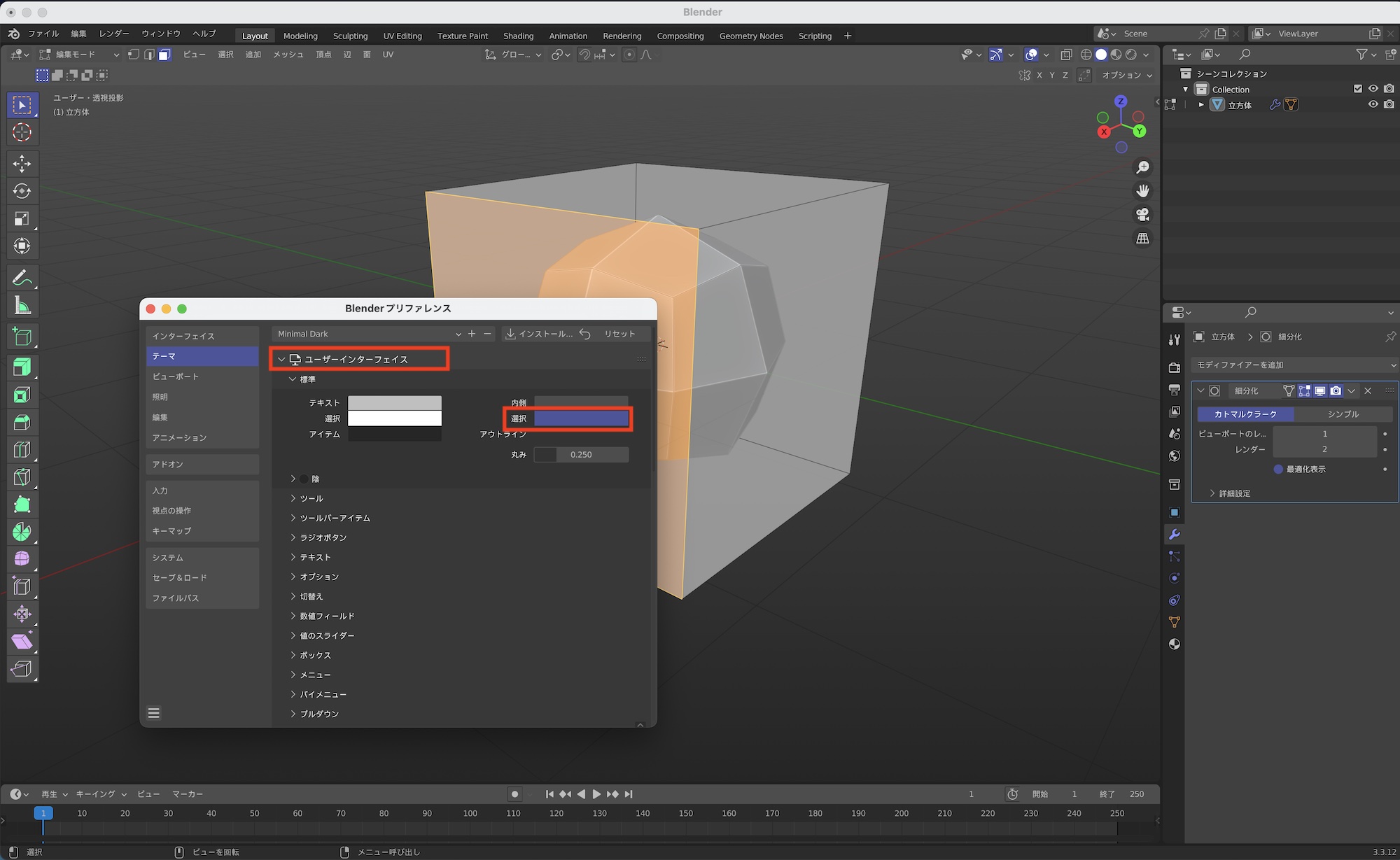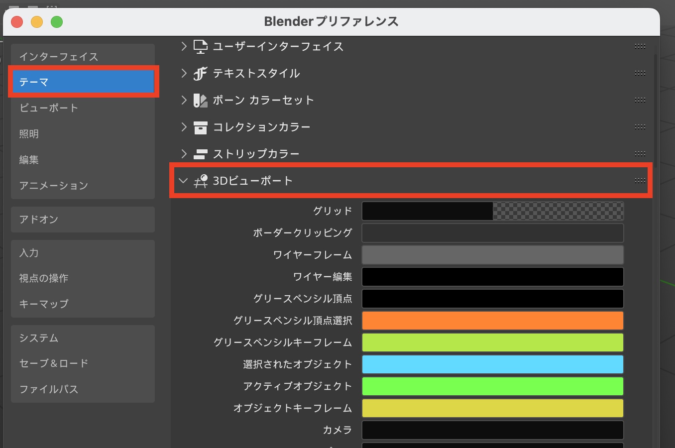 筆者の場合、Cinema 4Dのビューポートに近づけるため、「3Dビューポート」の「アクティブな頂点・辺・面」をオレンジ色に、「頂点選択」と「辺選択」、「面選択」を薄いオレンジ色に、法線である「面の後方向」を青色、「面の前方向」をオレンジ色に変更しています。