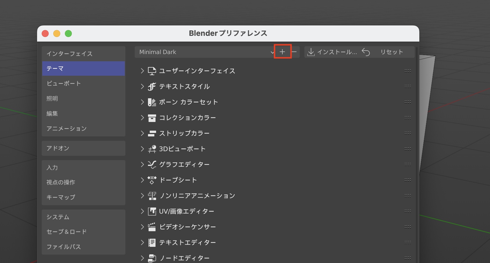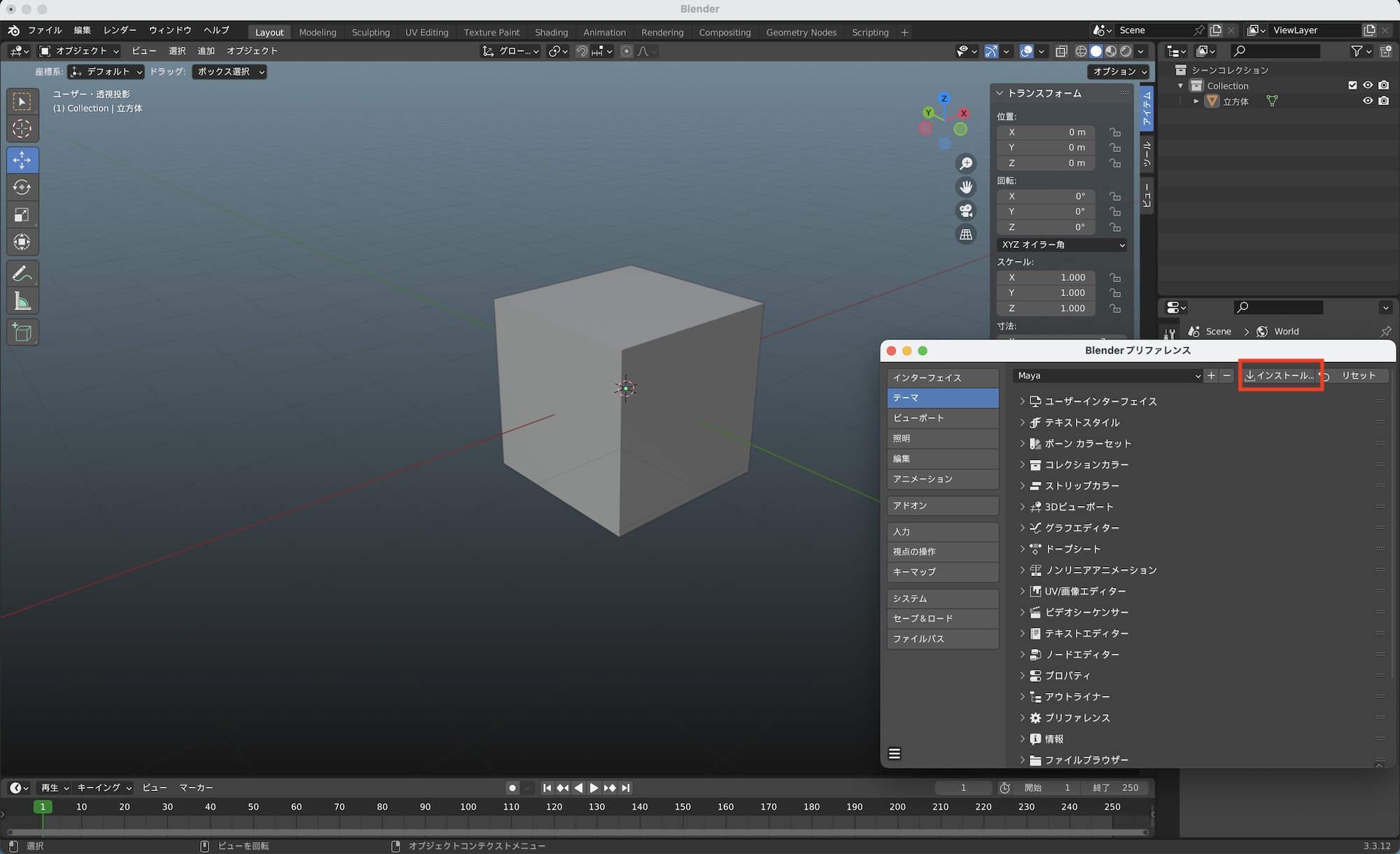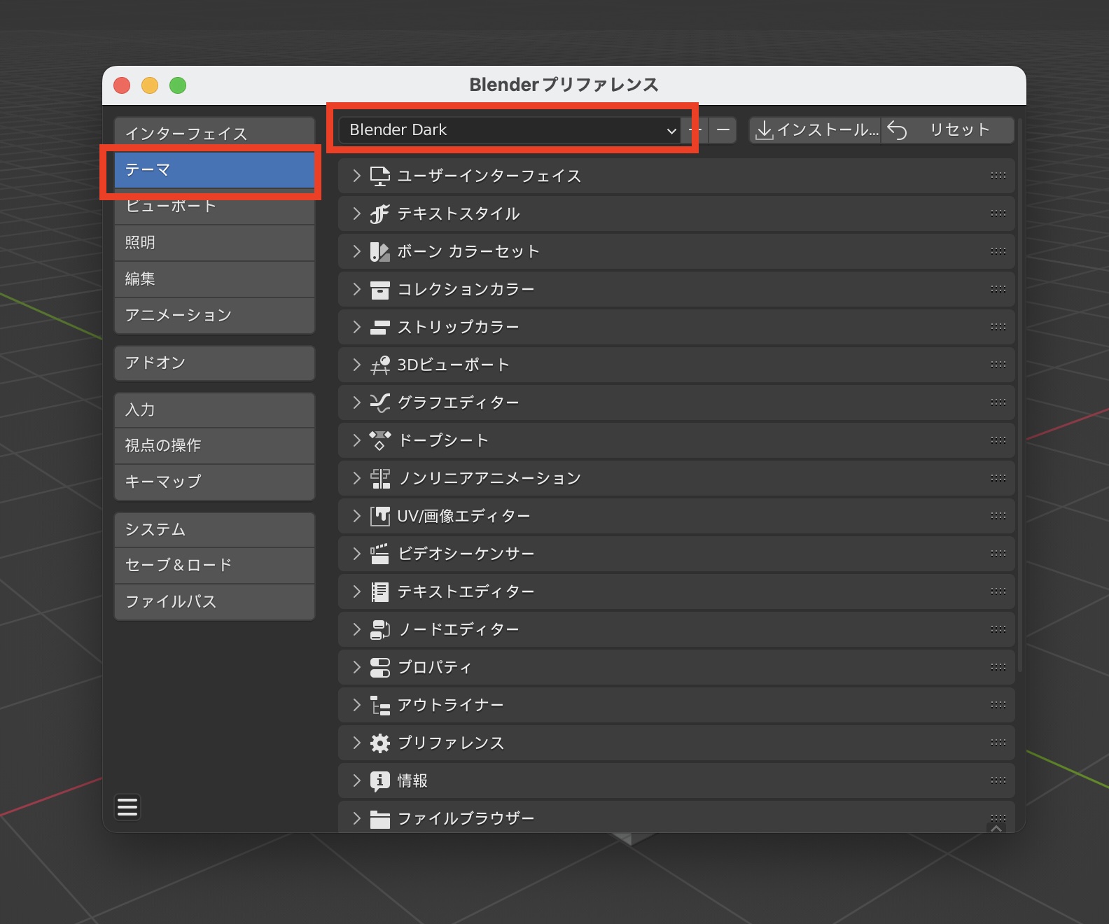 MayaやModoといった他社製の3DCGソフトウェアに近い見た目のものもあるので、そこから変更するか、「インストール」のボタンからXML形式のカスタムテーマをインストールすることも可能です。