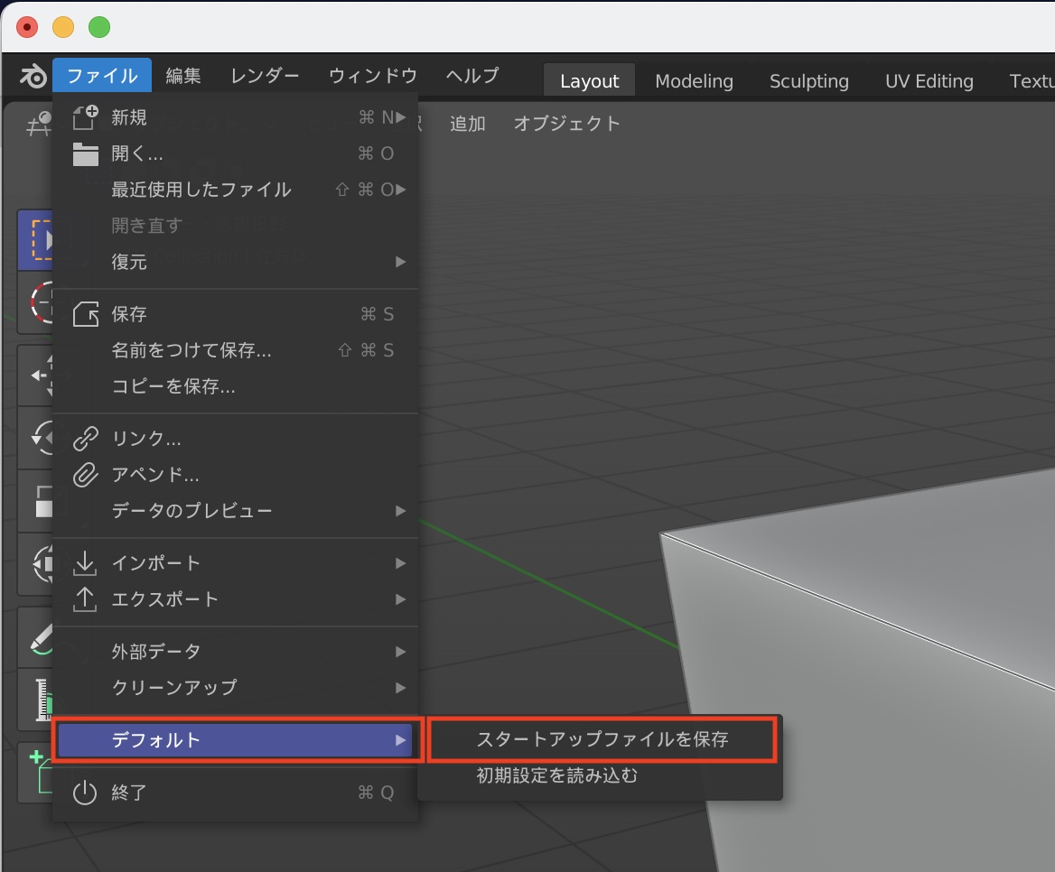 オブジェクトを削除してから作業を開始することも出来ますが、予めデフォルトオブジェクトが削除された状態で作業したい場合は「スタートアップファイル」をカスタマイズすると良いでしょう。
