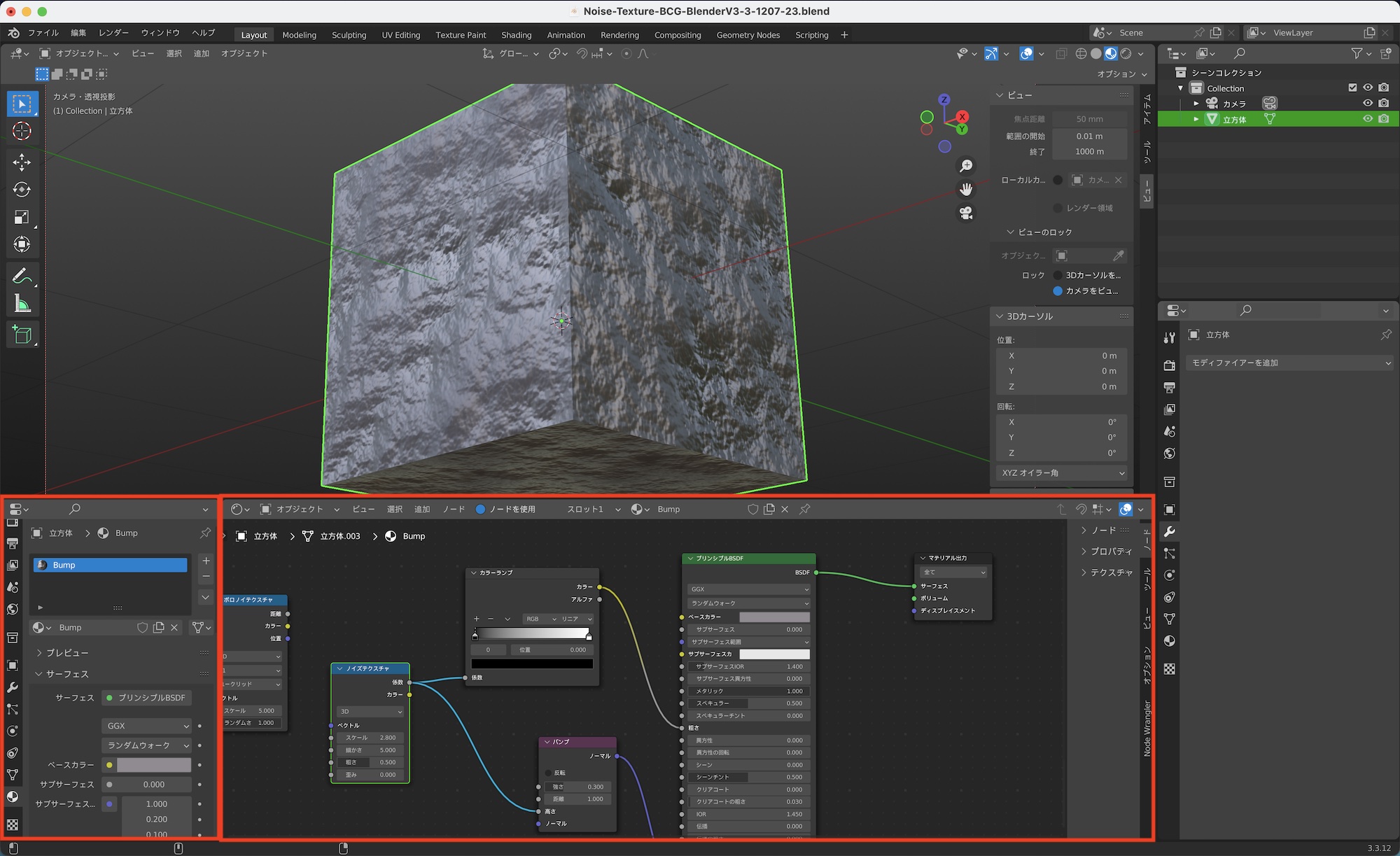 筆者がCinema 4Dを使用していた時はビューポートの下にマテリアルマネージャを配置していたのですが、同じような機能はBlenderには無いので、代わりにマテリアルを調整できる「マテリアルプロパティ」と「シェーダーエディター」をビューポート下に表示されるようにしています。