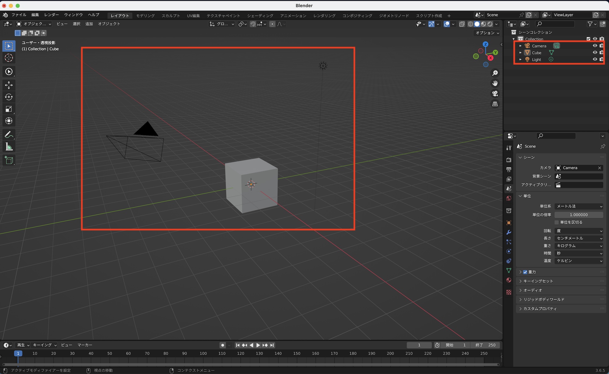 Blenderを起動する際、モデリングやシーンの作成を円滑に行えるように立方体やカメラ、ライトといったオブジェクトがビューポートにデフォルトで表示されており、これらのオブジェクトを使ってシーンを作ることができます。