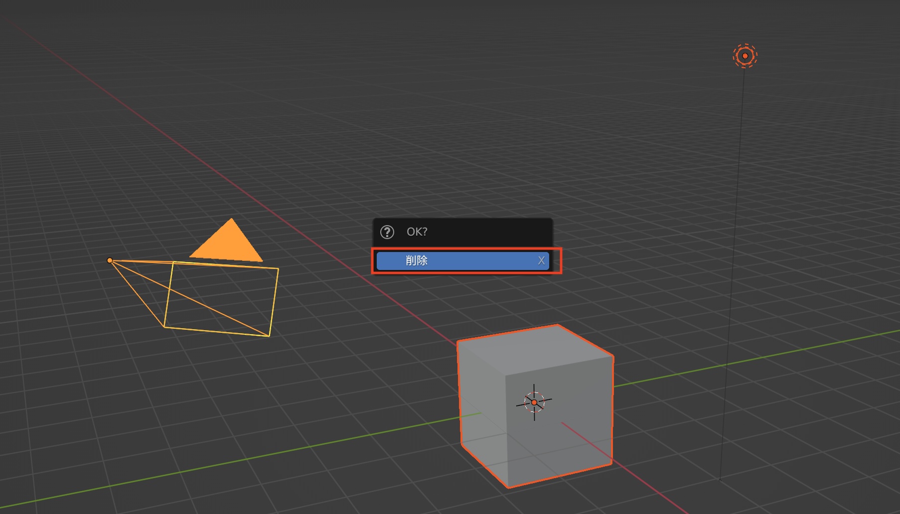 ビューポートまたはアウトライナーからカメラ、立方体とライトを選択し、「X」キーを押して、「削除」をクリックします。