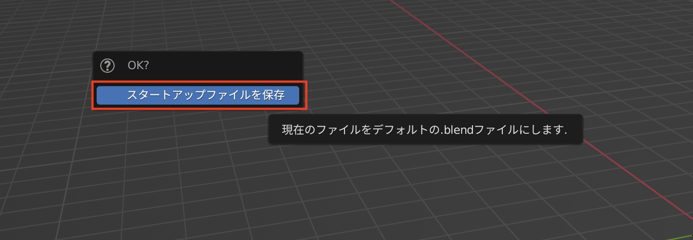 ビューポート上にオブジェクトが表示されなくなったら、上部メニュー「ファイル」の「デフォルト」の中にある「スタートアップファイルを保存」を選択します。