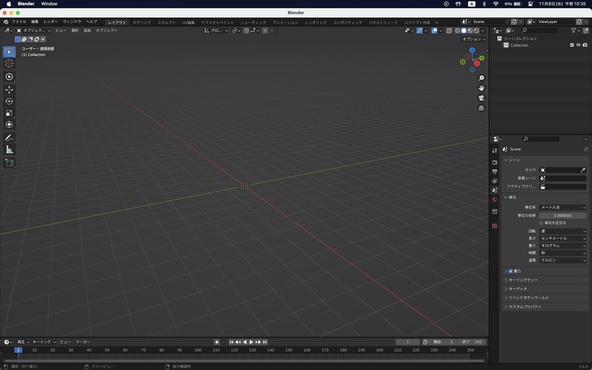 Blenderを再度起動してみると、下の画面のようにデフォルトのオブジェクトが表示されなくなりました。