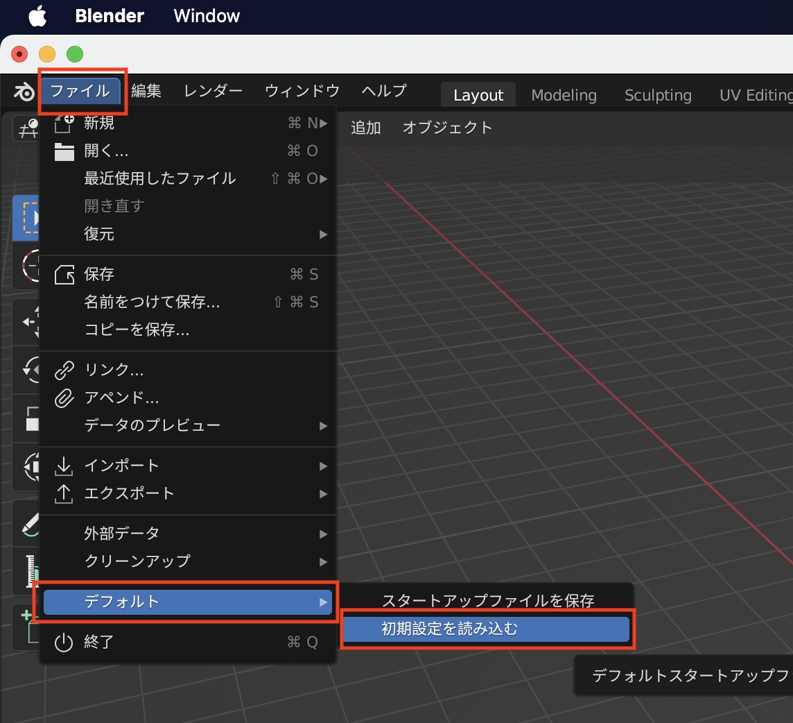 筆者の場合は基本的にビューポートに何も表示されない状態での作業が最適だと感じているので、デフォルトのオブジェクトを削除していますが、万が一初期設定に戻したい場合は、上部メニュー、「ファイル」の「デフォルト」にある「初期設定を読み込む」をクリックすると良いでしょう。
