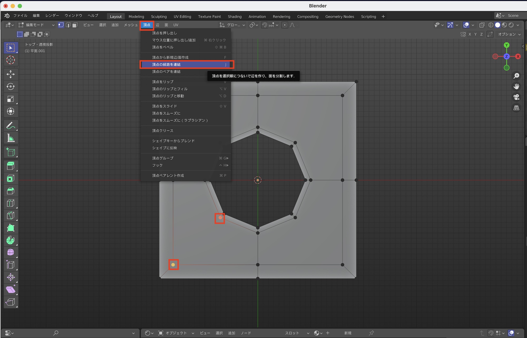次にnゴンとなっている面の調整を行います。辺のない頂点とその奥にある頂点を選択して「J」キーまたは、上部メニューの「頂点」から「頂点の経路を連結」をクリックして、辺を作成します。同じように残りの頂点も連結させましょう。