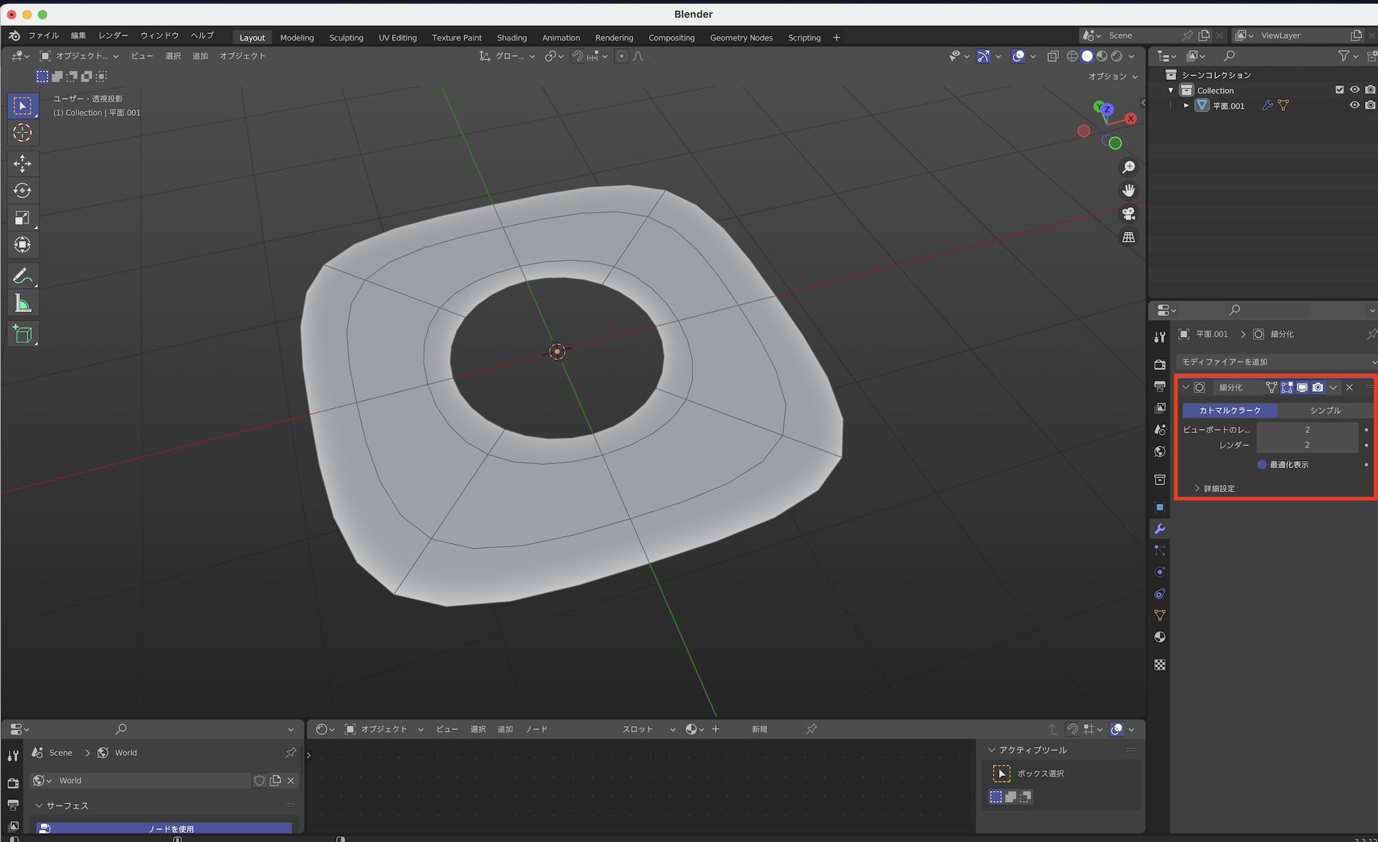 後はオブジェクトにサブディビジョンサーフェス(SDS)モディファイアーを適用すれば完了です。滑らかに見えない場合はスムーズシェードにしたり、SDSの分割数(ビューポートのレベル数)などを調整してみてください。