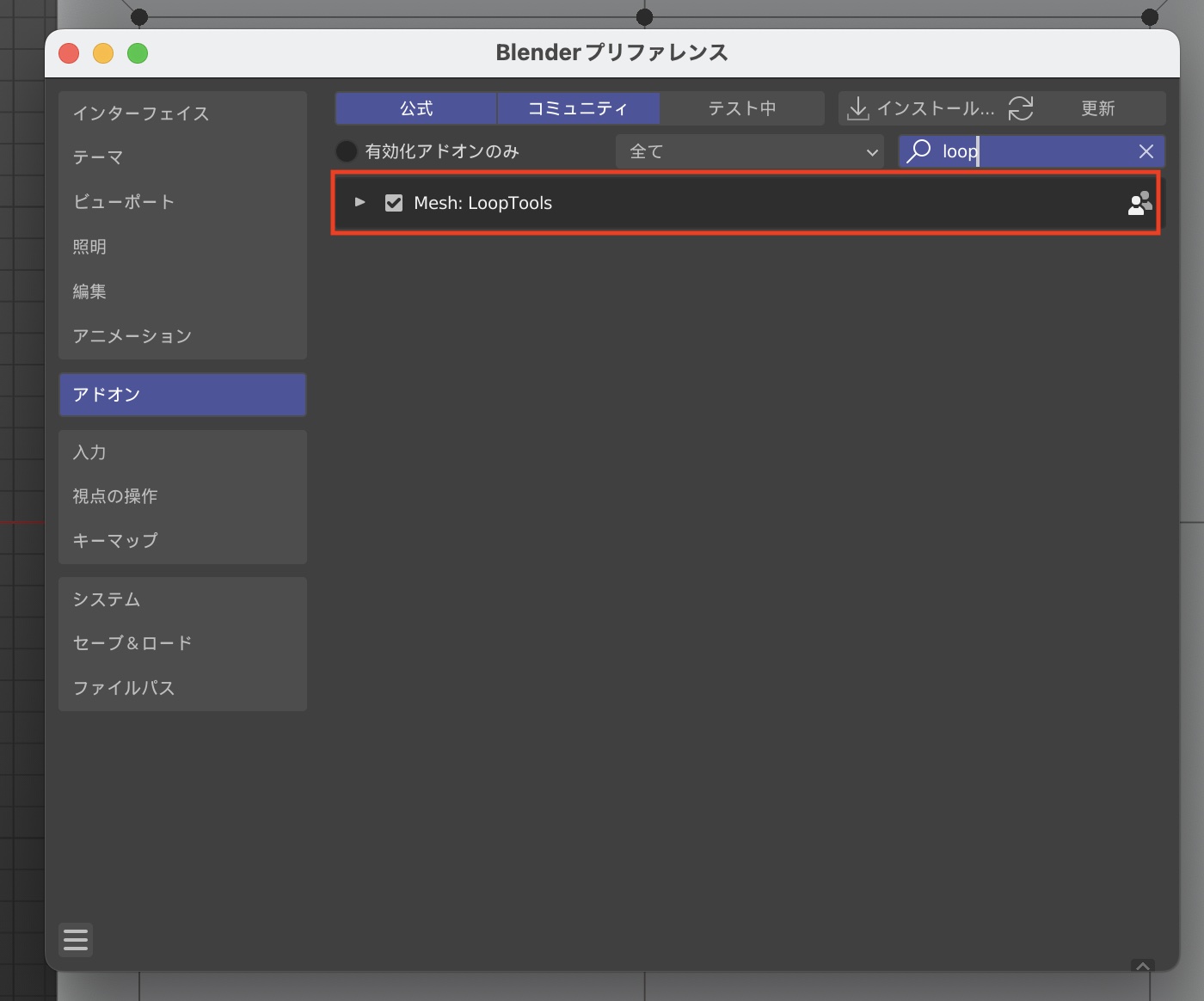 プリインストールされているものの、デフォルトでは有効化されていないので、プリファレンスのアドオンの検索画面から「LoopTools」と入力し、「Mesh: LoopTools」のチェックを入れて有効化します。