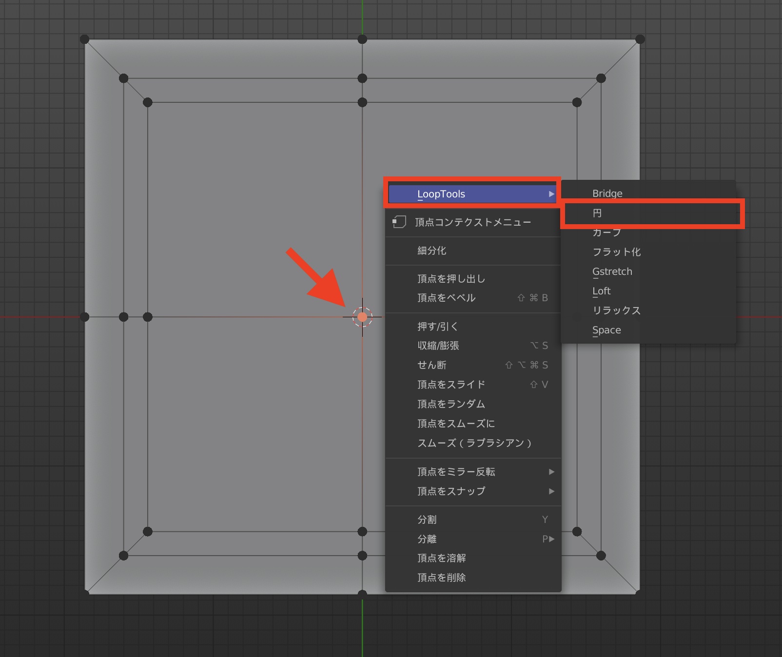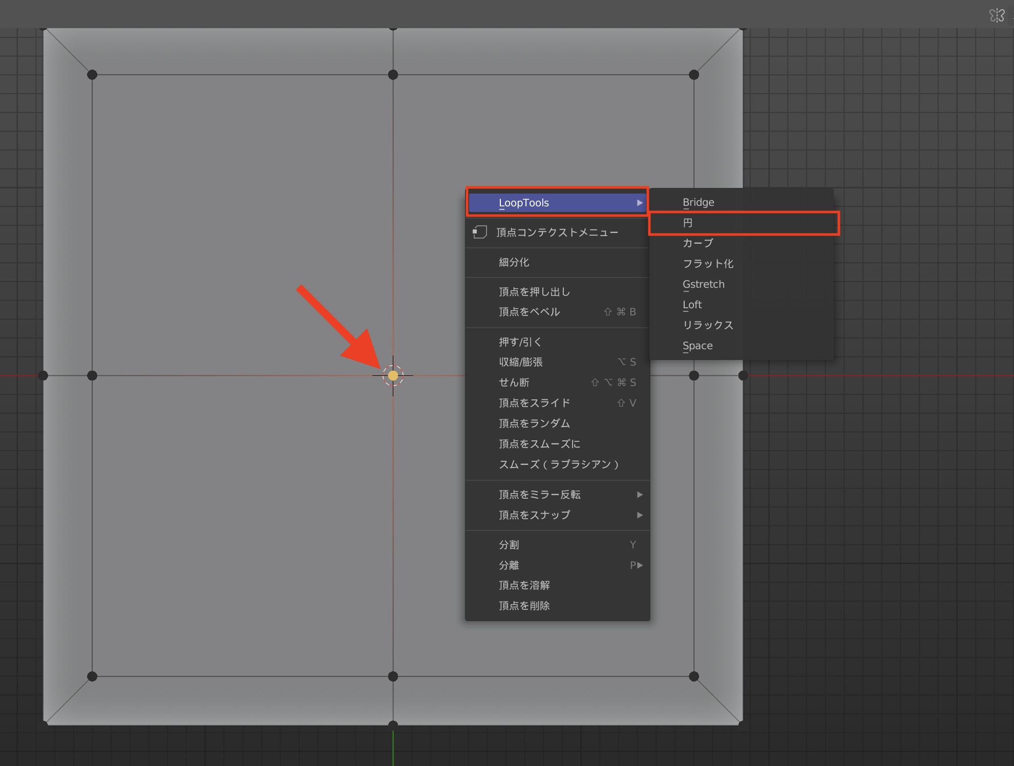 次に穴の中心となる頂点を選択して、右クリック「LoopTools」の「円」をクリックします。