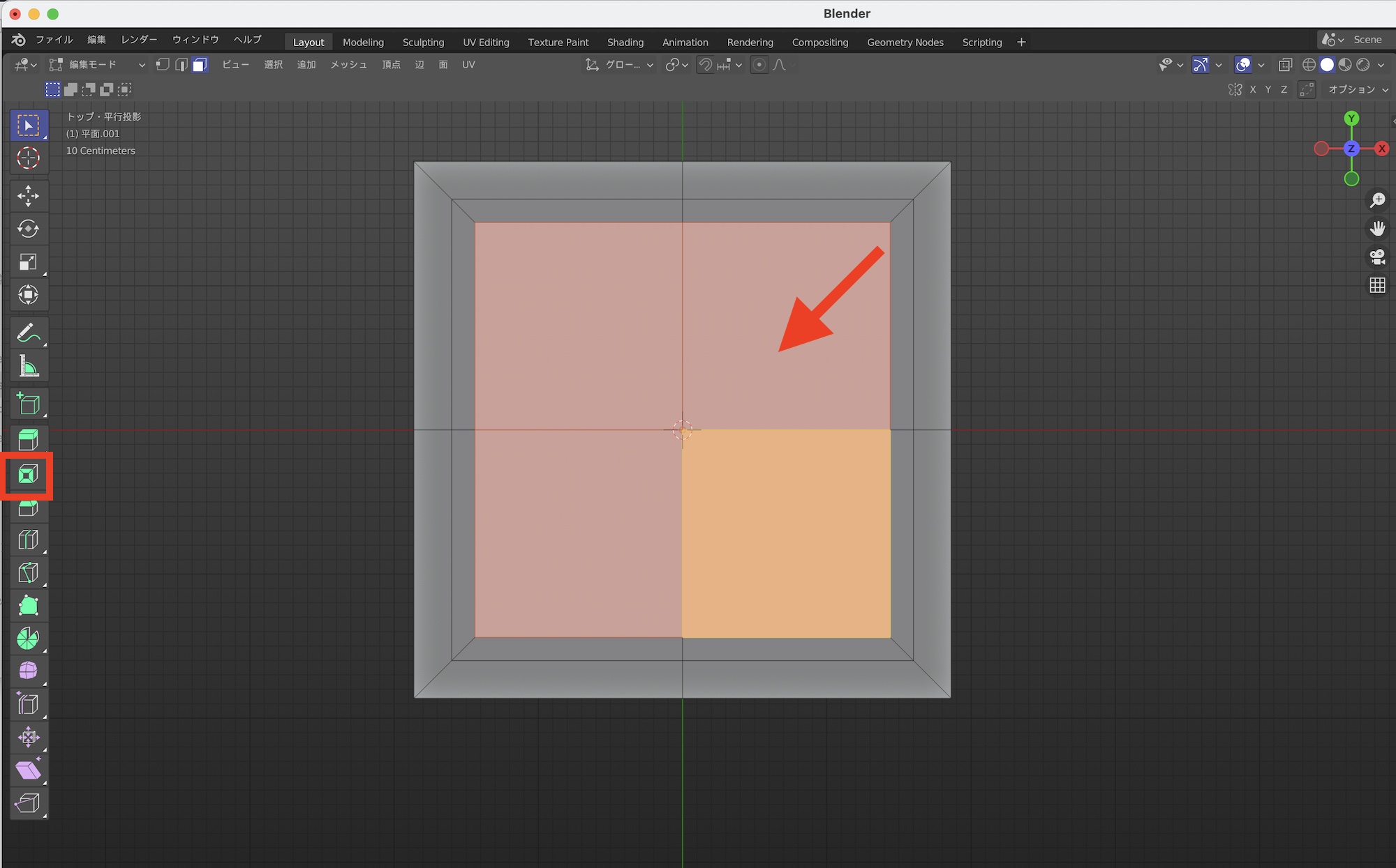 まず、穴となる円形の中心部分を作成するため、ループカットを2回行って新しく頂点を作成します。なお、すでに十分な頂点がある場合は新しく作成する必要はありません。
