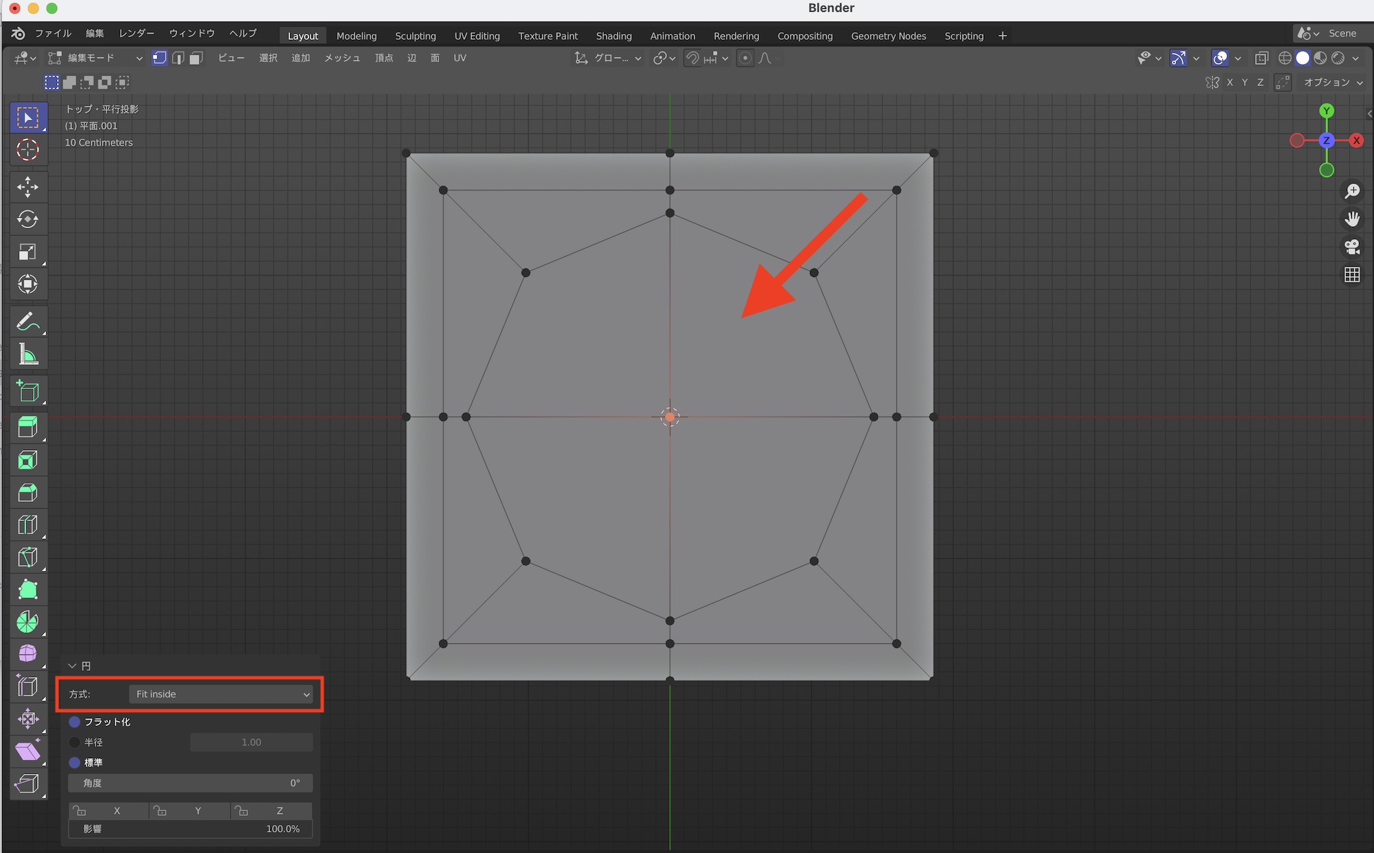 円形が外側にあふれる場合は左下のオプションの「方式」を「Fit inside」に変更します。