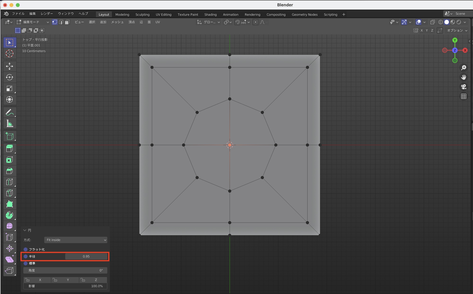 穴のとなる円のサイズを変更するにはLoopToolsの「半径」を操作するか、頂点を選択して「スケール(S)」で調整します。