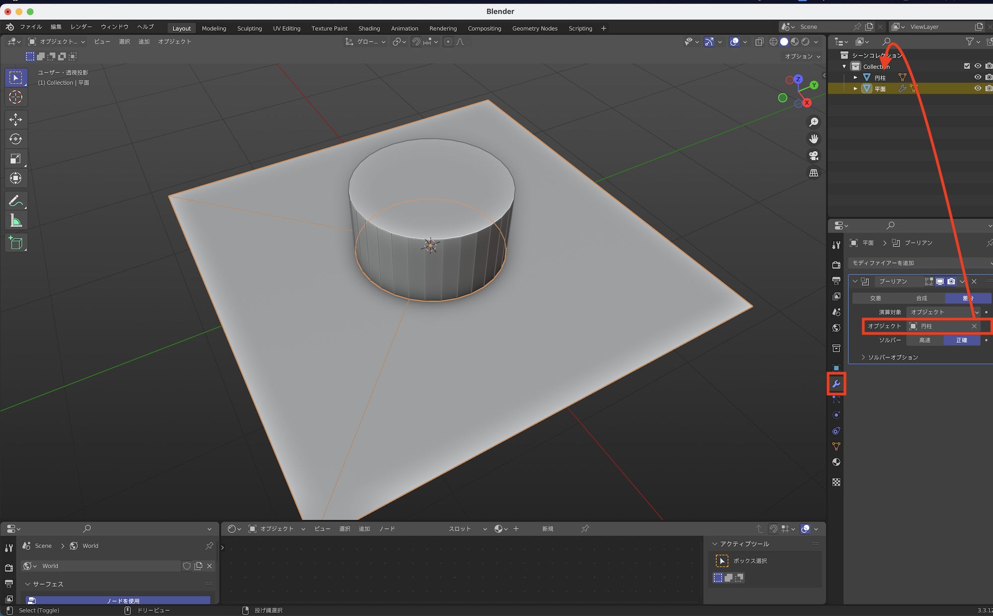 平面を選択して、モディファイアープロパティから「ブーリアン」を選択して、ブーリアンモディファイアーを追加した後は、「オブジェクト」の項目で「円柱」を選択します。