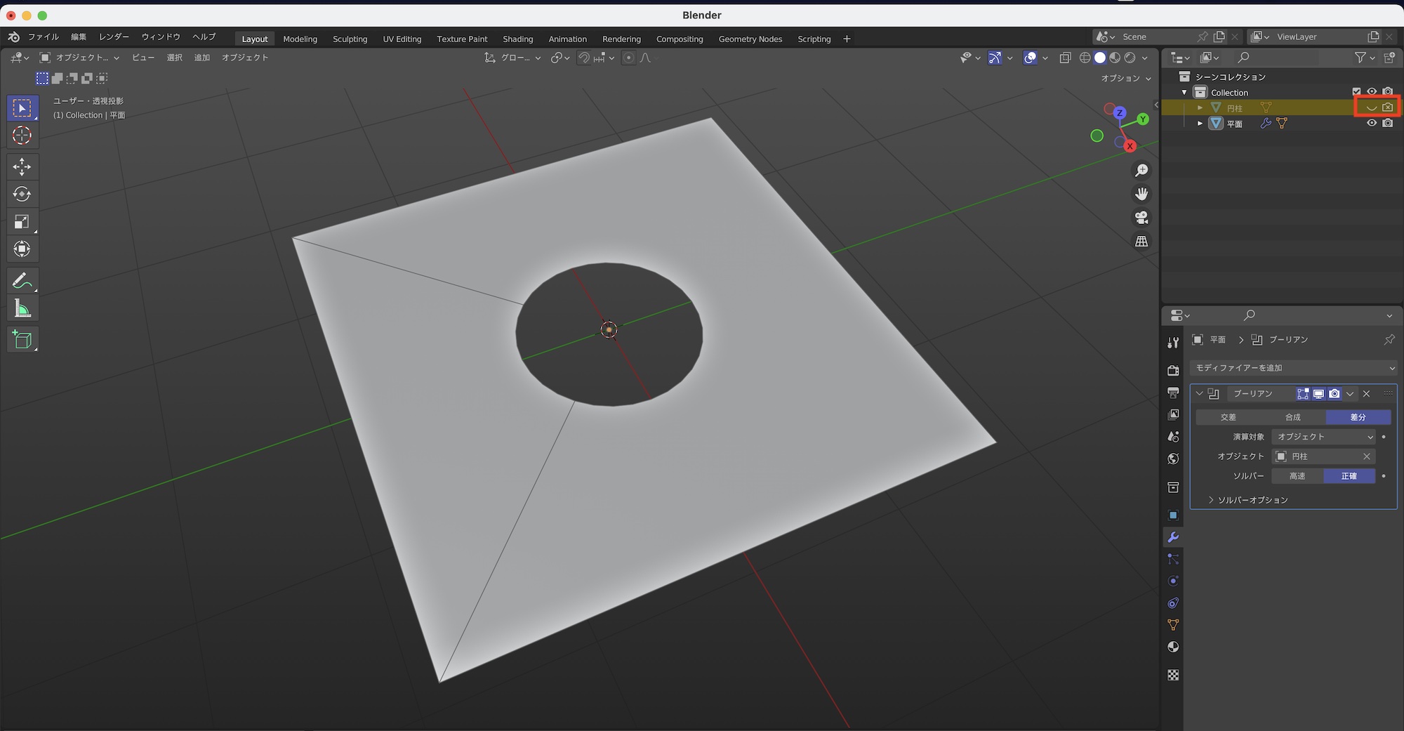 最後はアウトライナーにある円柱の「ビューポートで隠す」と「レンダーで無効」をにして非表示にすると、ブーリアンの効果が適用されて平面に穴を開けることが出来ます。