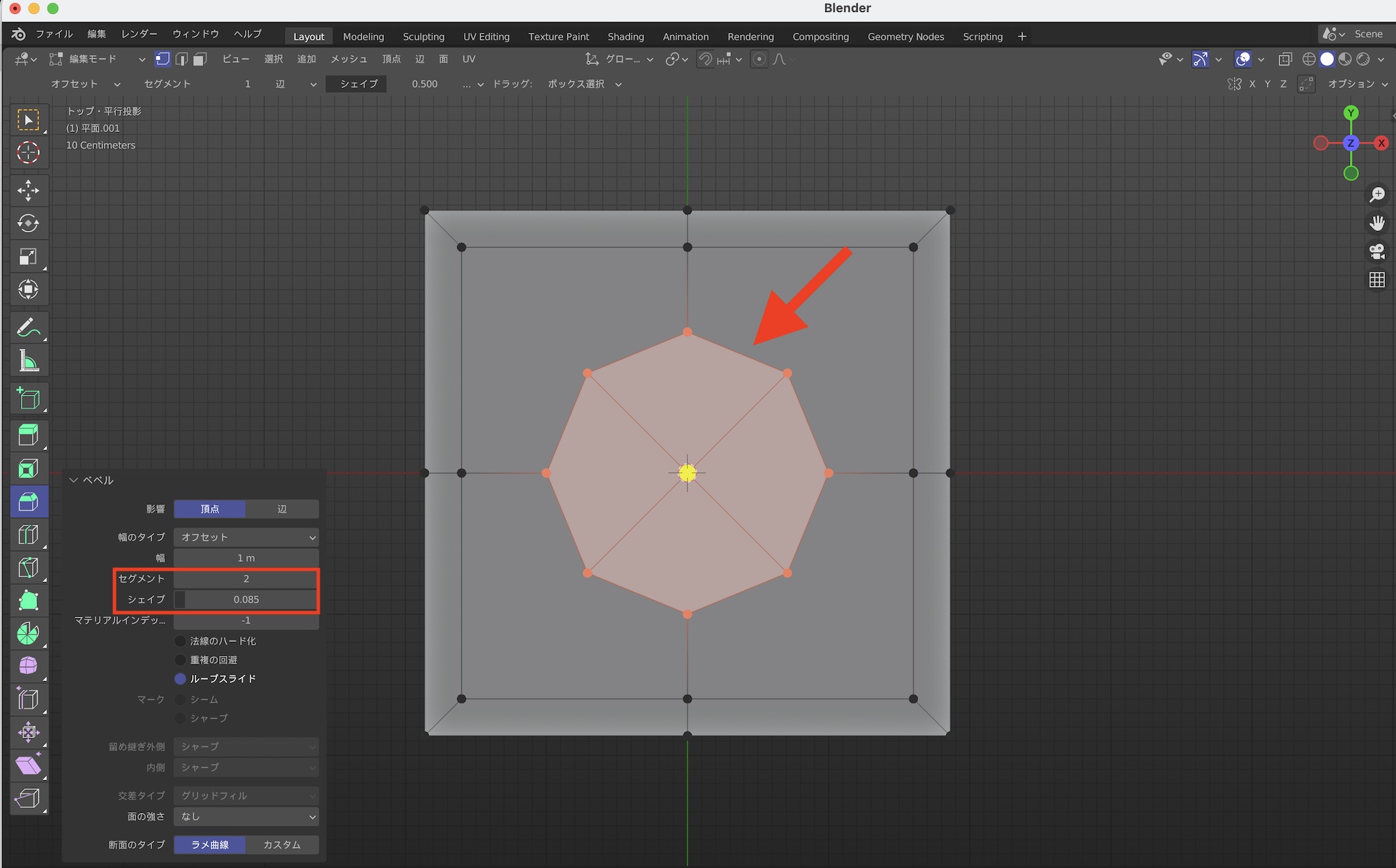 中心にある頂点を選択して、「ベベル」を使って新しい面を作成します。左右にドラッグしても何も起こらない場合は、左下のオプションの「影響」を「頂点」にします。